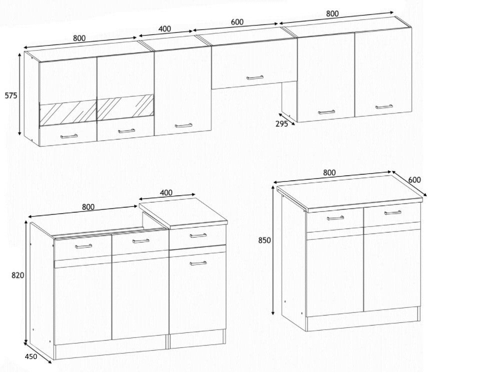 Køkkenmøbler kan ofte købes som et sæt eller ved at kombinere skabe separat. I begge muligheder er der et mellemrum bag hvert køkkenskab langs væggen, designet til VVS. Den større dybde i skabe til indbyggede apparater og hjørneenheder skyldes, at disse skabe ikke har mellemrum til rørføring. Dette mellemrum er skjult af bordpladen ovenfra. Hvis skabe sælges uden bordplader, skal disse købes og fastgøres separat. Bordpladen fastgøres med skruer og sælges uden forudskårne områder til vaske eller kogeplader. Når du køber et hjørneskab, er det vigtigt at købe en bordpladesamler for at eliminere eventuelle mellemrum i hjørnet.
