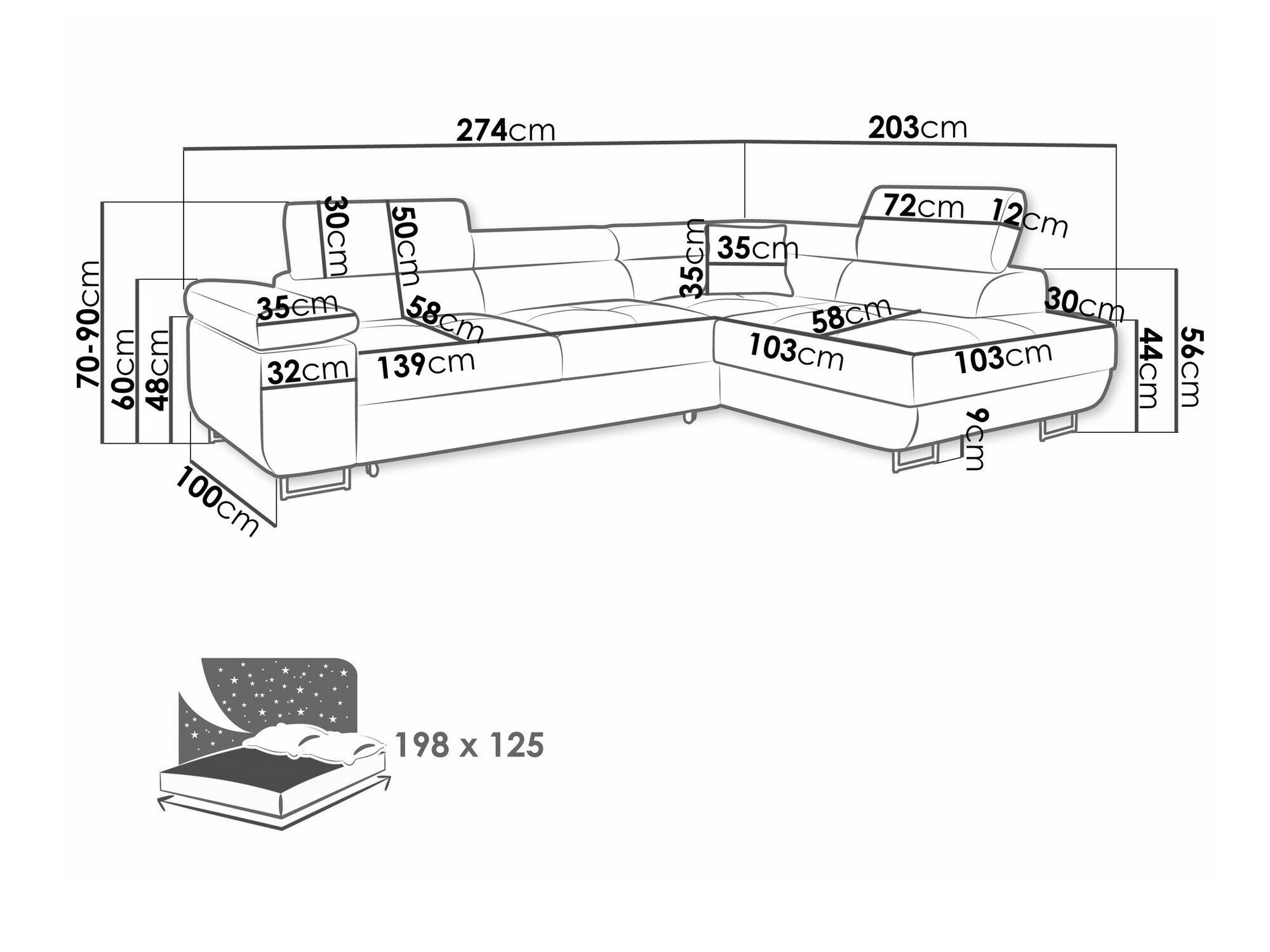70 cm  274 cm  203 cm
