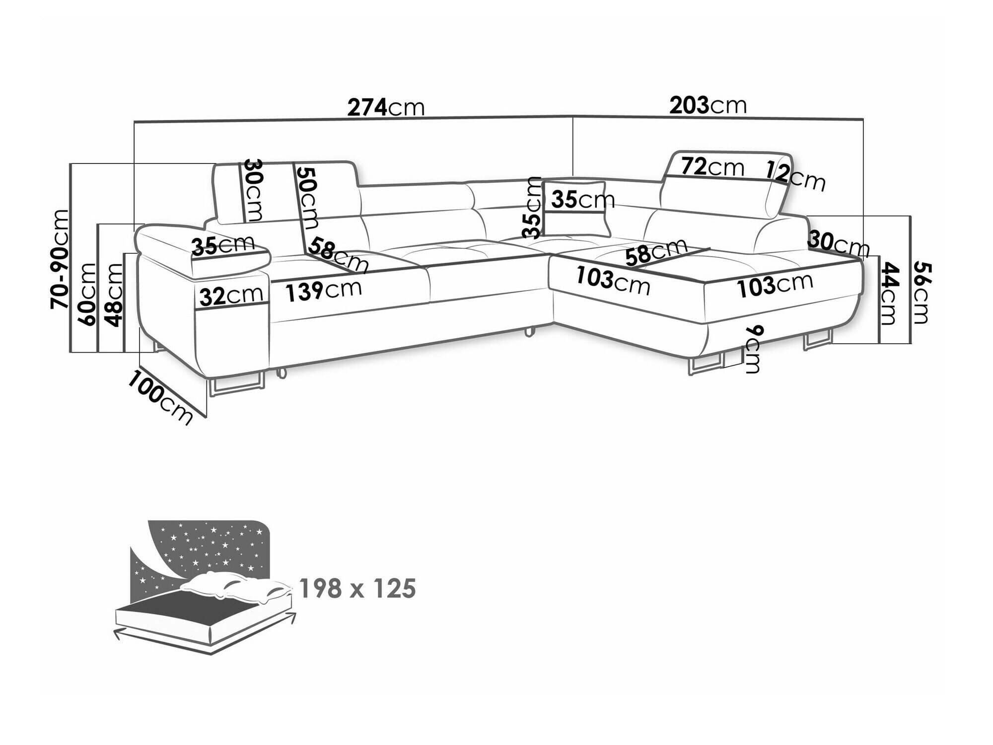 70 cm  274 cm  203 cm