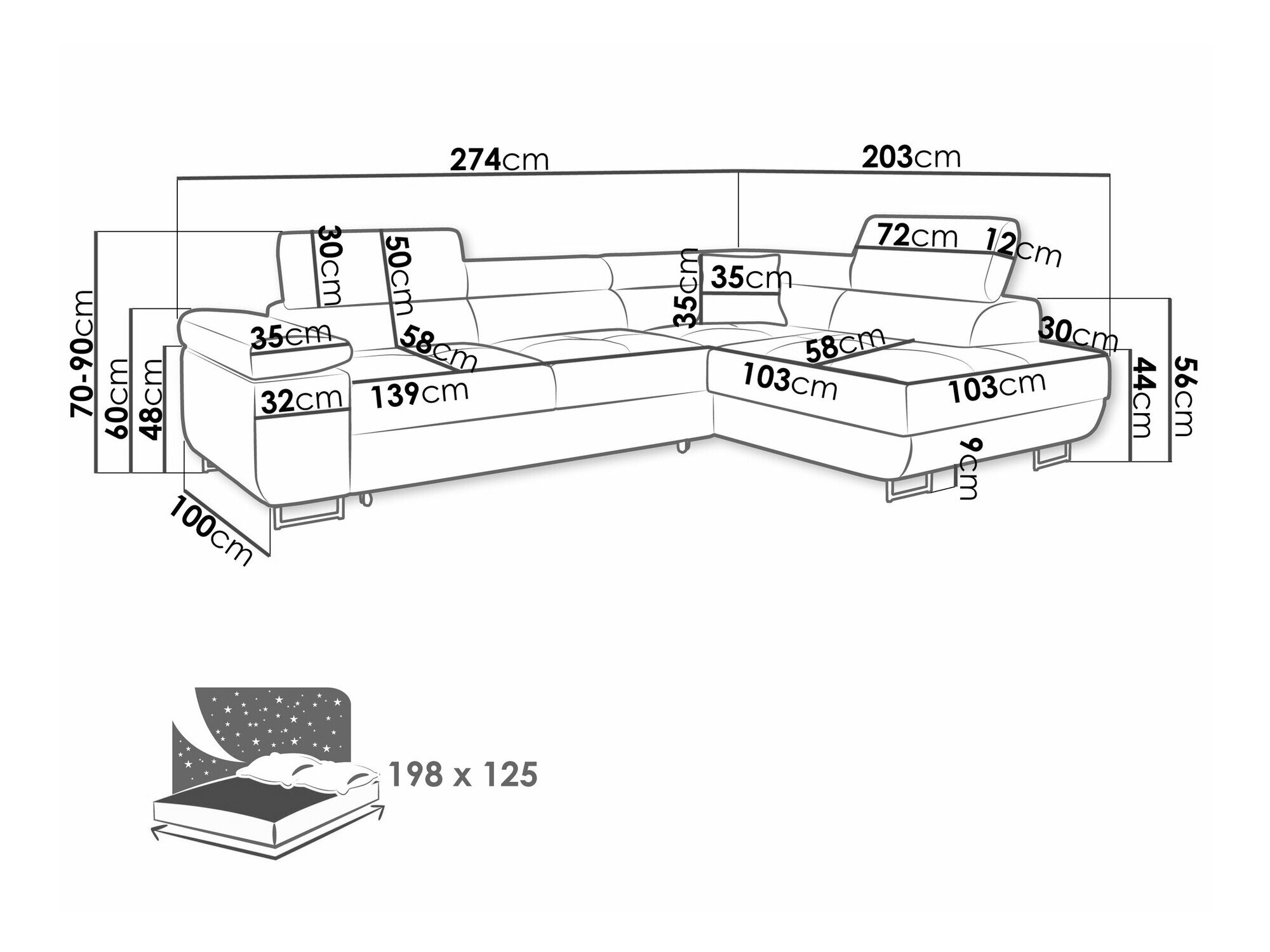 70 cm  274 cm  203 cm