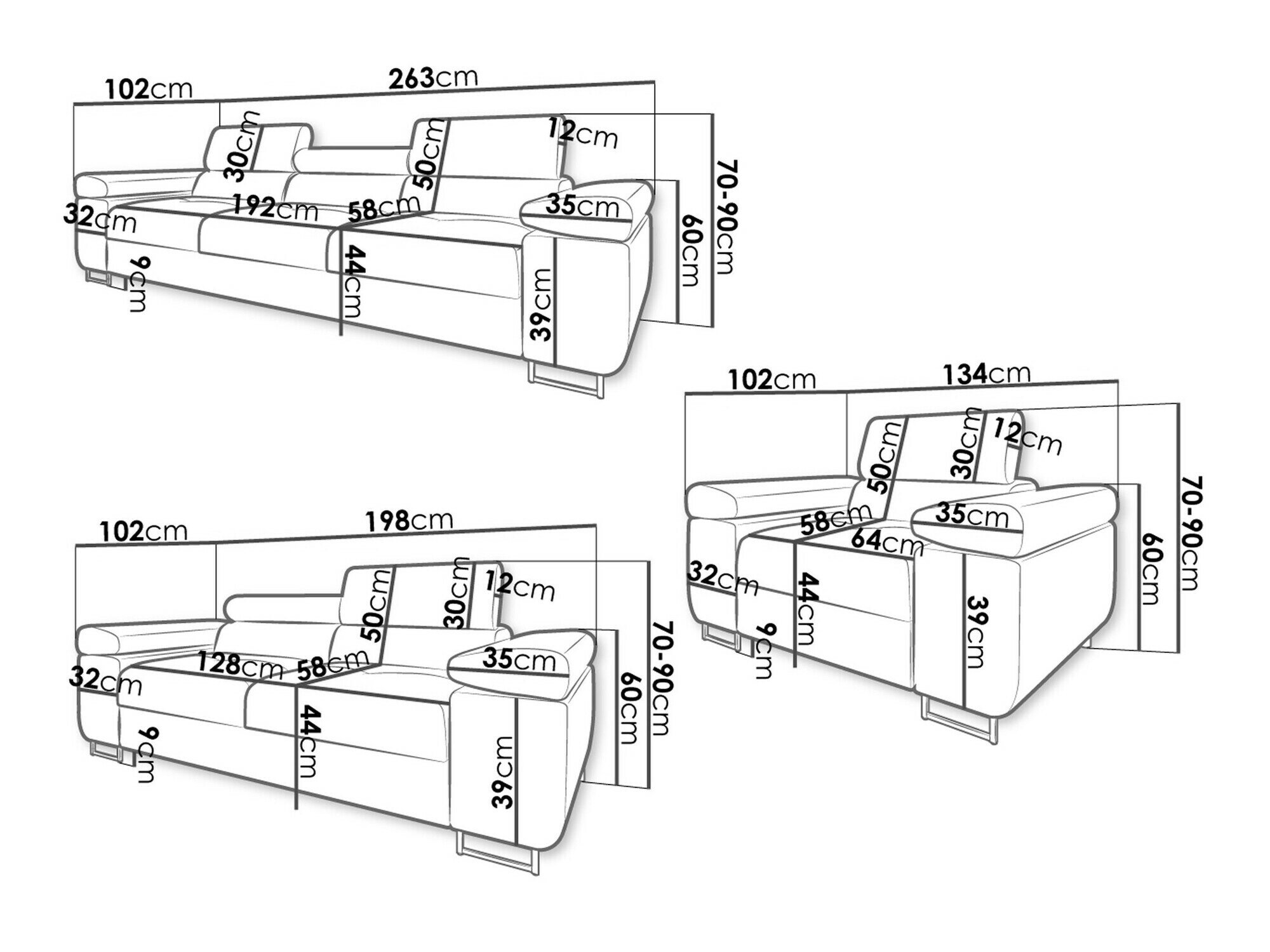 70 cm  198 cm  102 cm
