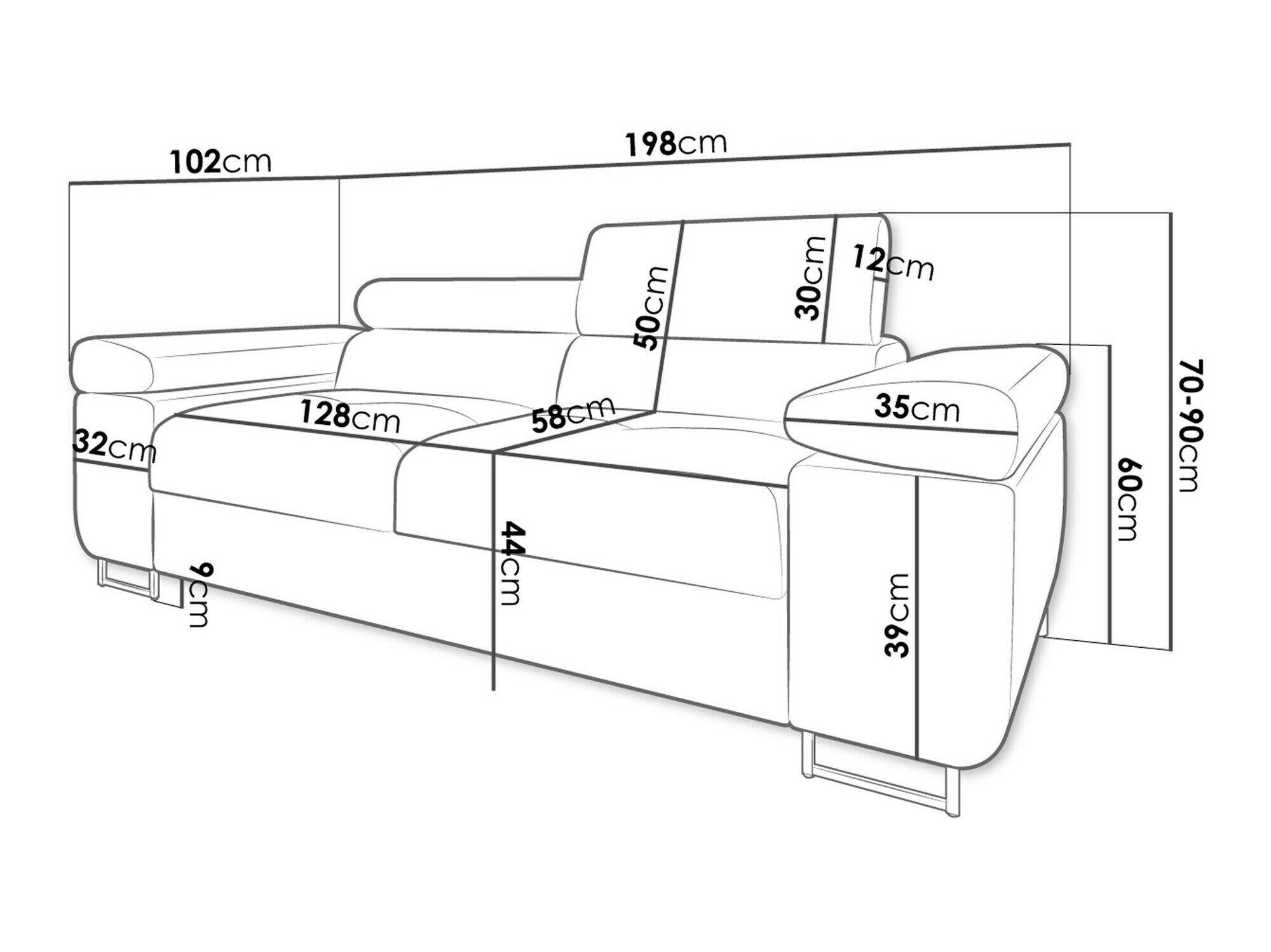 70 cm  198 cm  102 cm
