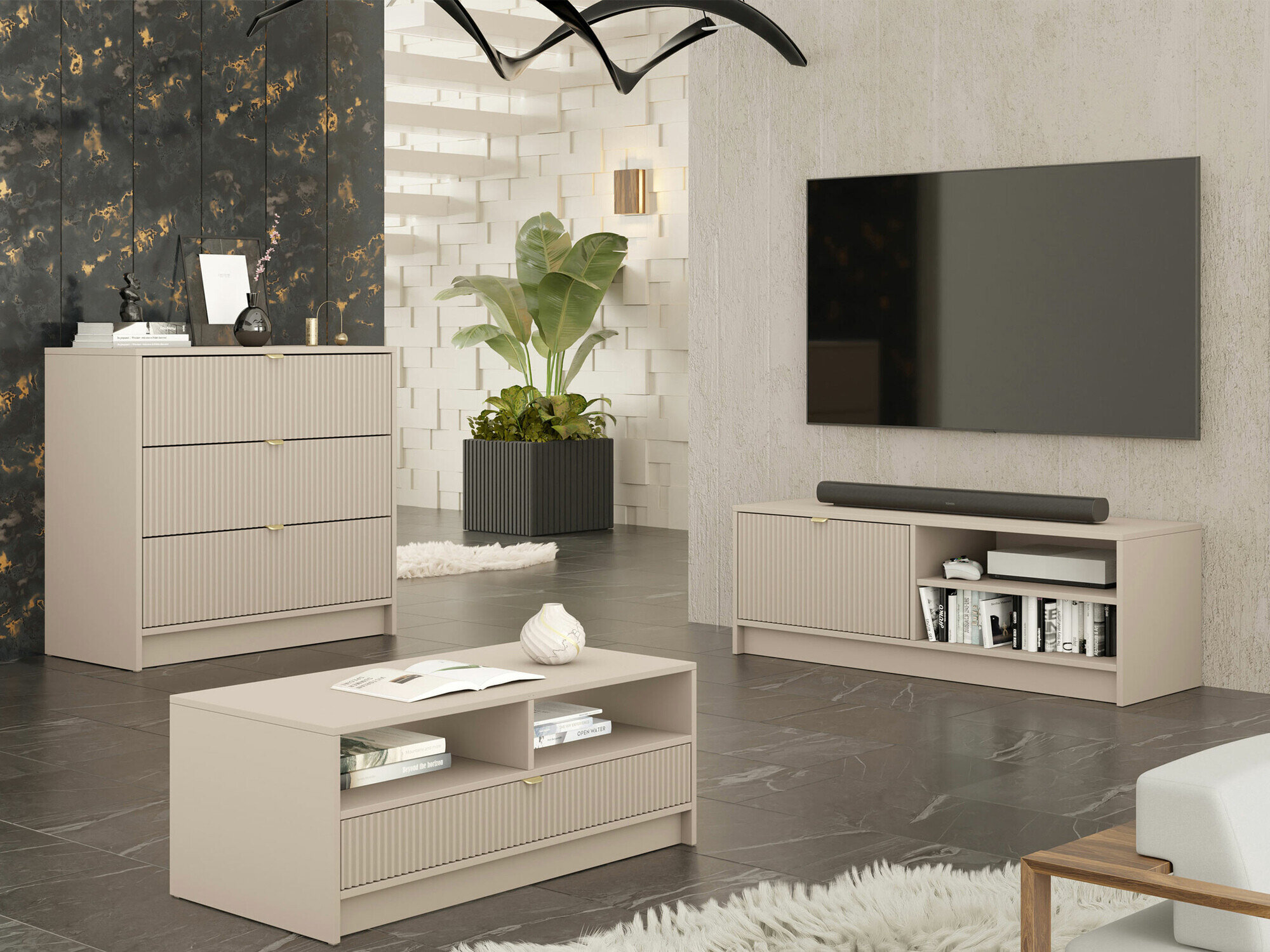Hjemmet bliver i stigende grad et rum, hvor daglige ritualer udspiller sig, hvor vi arbejder, slapper af og søger ro i sindet. Tendenser viser, at denne ændring inspirerer til et stigende ønske om komfort og autenticitet i vores boligrum. Denne møbelkollektion er omhyggeligt designet til at imødekomme dette behov. Bløde riller og riflede linjer giver hvert møbel et særpræg, mens guldfarvede metalhåndtag tilføjer et raffineret strejf af elegance. Kollektionen integreres nemt i en række forskellige rum – uanset om det er stuen, soveværelset eller hjemmekontoret – og passer harmonisk sammen med en lang række indretningsstilarter. Den er særligt velegnet til moderne klassiske, minimalistiske og bløde interiører.