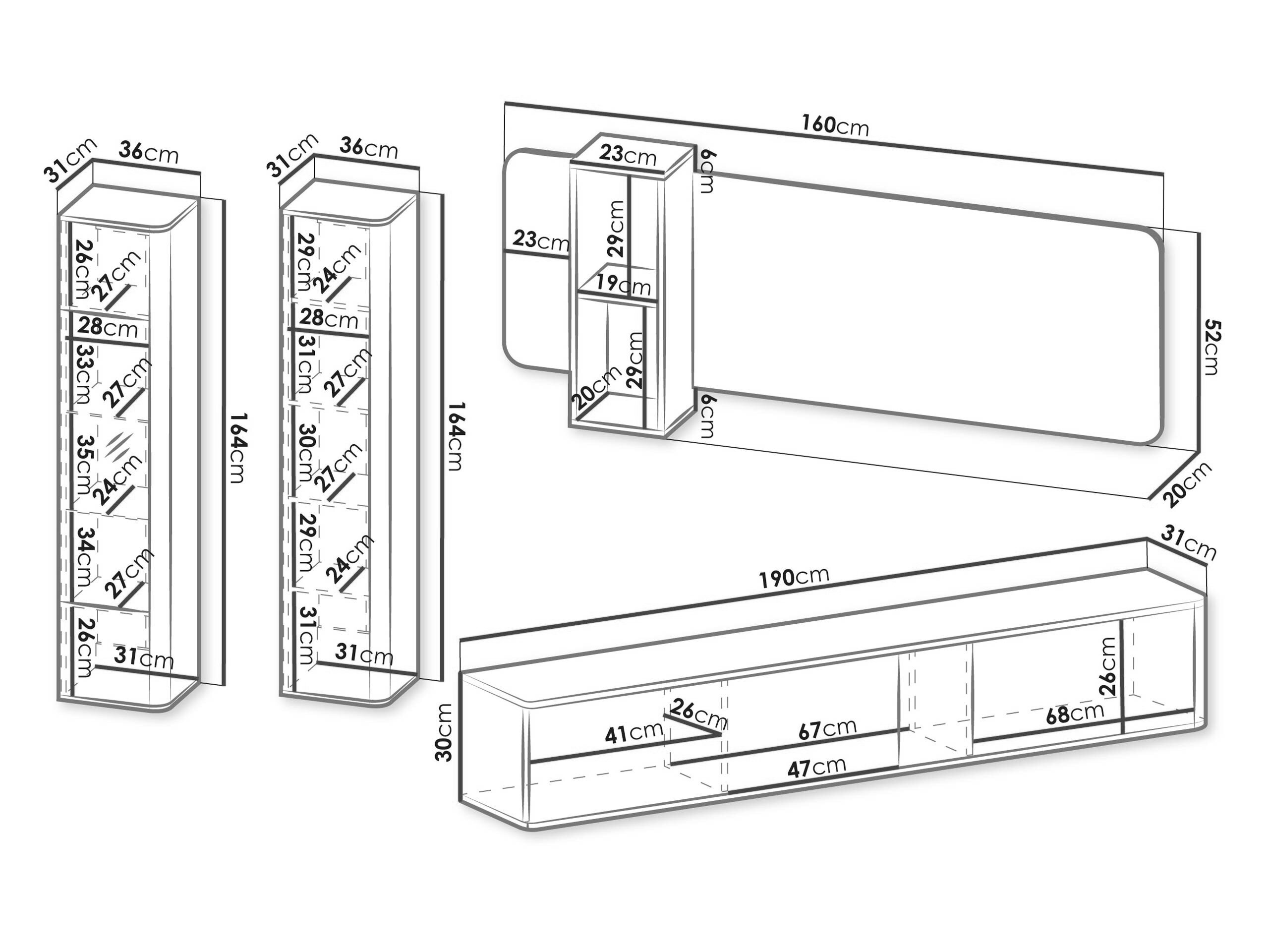 164 x 36 x 31; 52 x 160 x 20 cm