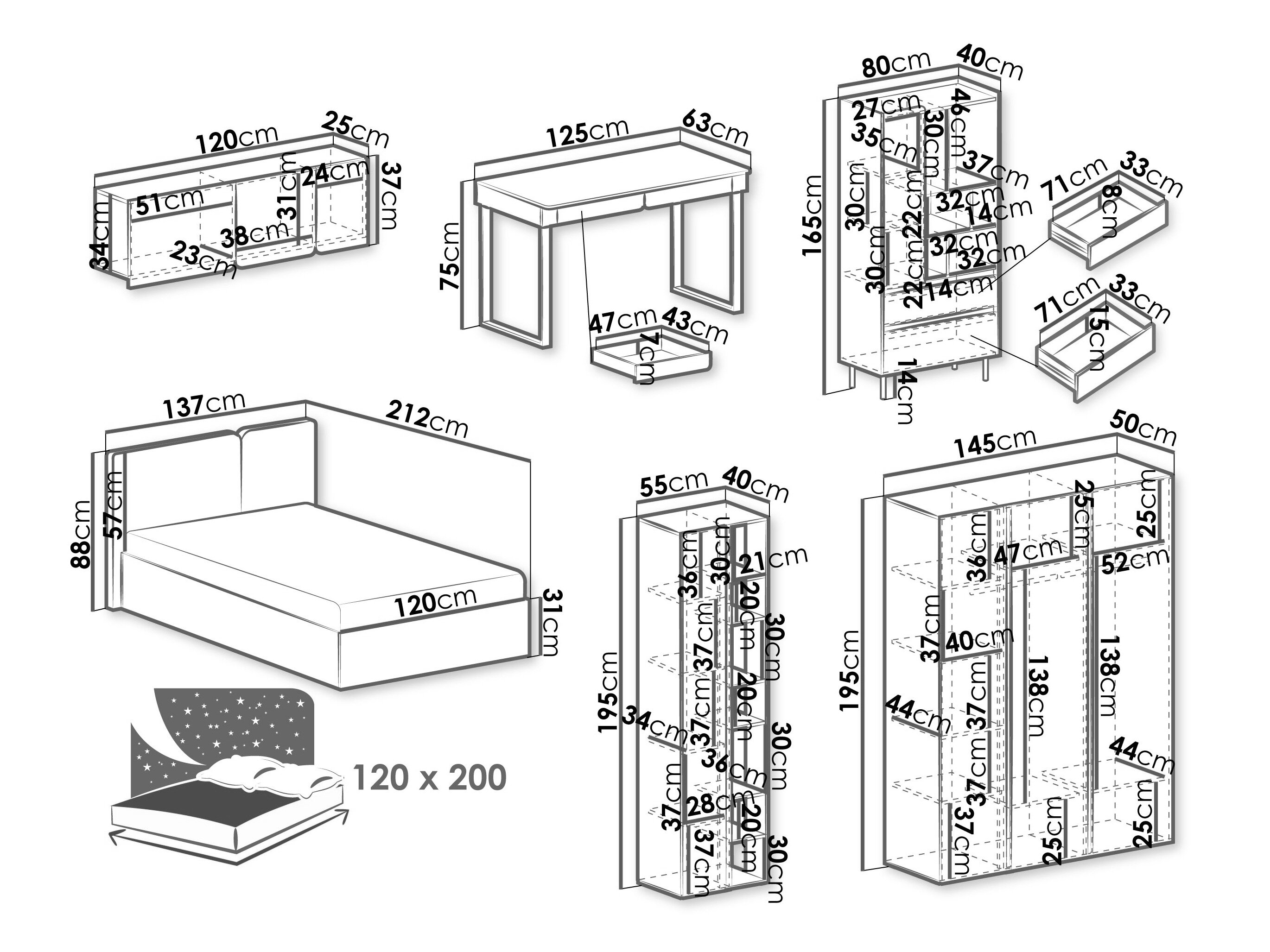 165 x 80 x 40; 195 x 55 x 40 cm