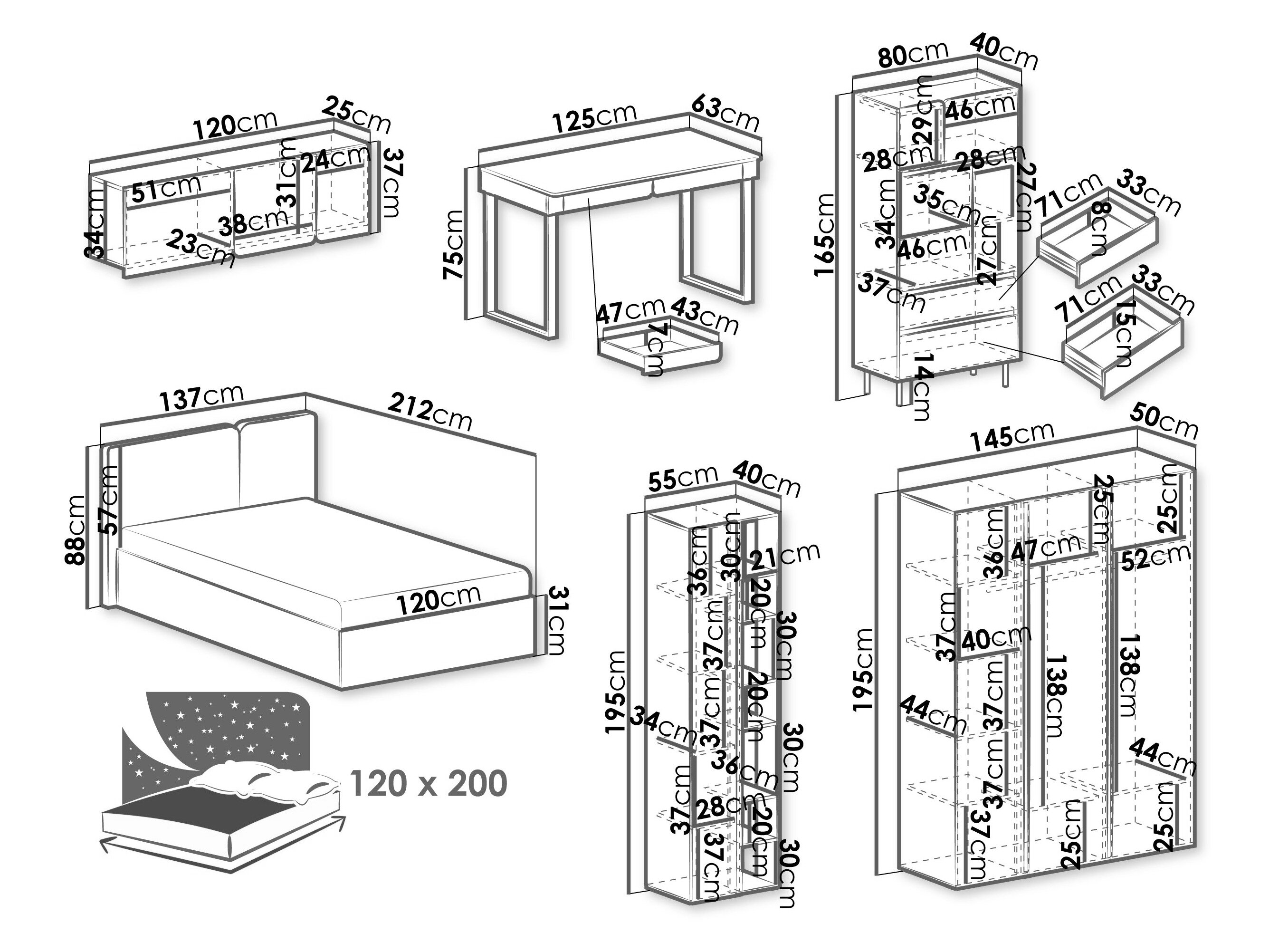 165 x 80 x 40; 195 x 55 x 40 cm
