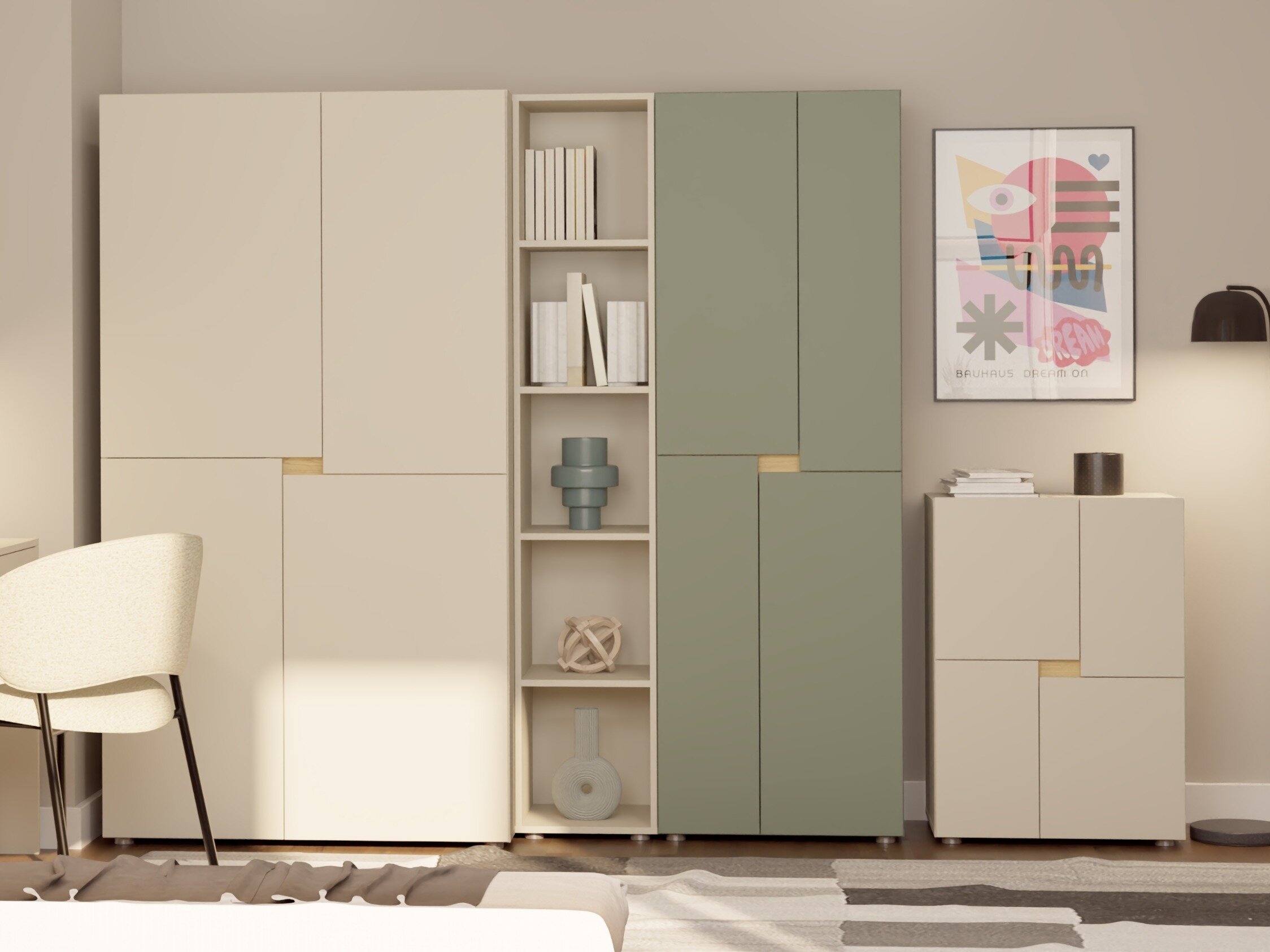 Et børneværelse er et rum, hvor de første ideer opstår, hvor leg finder sted, og hvor hverdagens opdagelser udfolder sig. I dette miljø er alt vigtigt – fra komfort og funktionalitet til æstetik, der hjælper barnet med at føle sig virkelig hjemme i sit eget rum. Denne møbelkollektion er designet med netop det for øje. Den bløde kashmirfarve skaber en følelse af åbenhed og ro, mens det moderne design bevarer et rent, minimalistisk udtryk. Disse møbler er velegnede til børn i forskellige aldre og vokser med dem over tid. Kollektionen består af et skrivebord, en kommode og en seng og er med til at skabe et funktionelt, hyggeligt og let at vedligeholde miljø – et rum, hvor børn kan føle sig trygge, inspirerede og frie til at skabe deres egen verden.