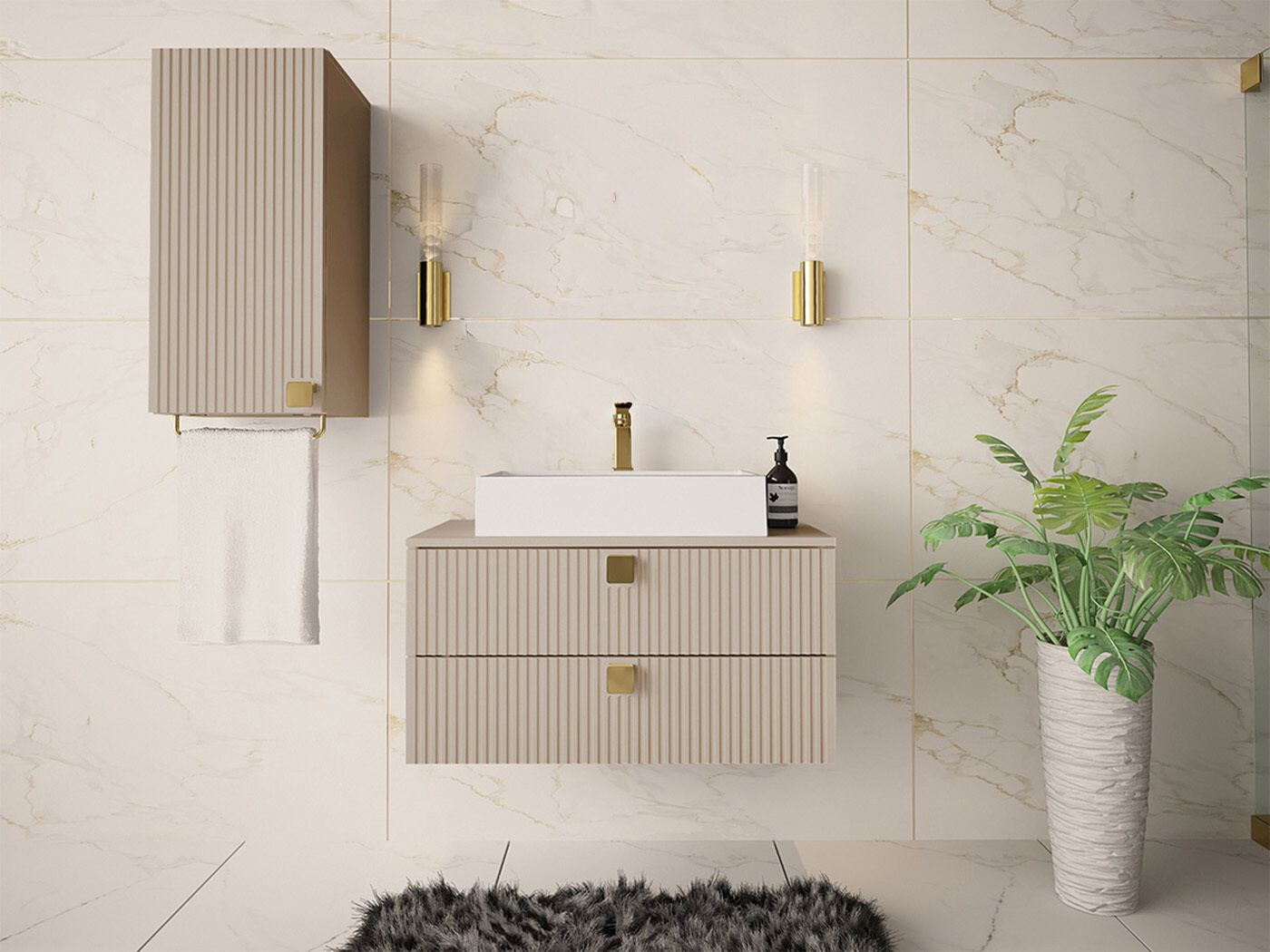 Badeværelset er et rum, hvor man søger ro, en følelse af renlighed og gennemtænkte løsninger, der giver mulighed for et øjebliks pause. Denne moderne klassiske badeværelsesmøbelkollektion er designet netop til sådanne øjeblikke. Subtile riller på skabsfronterne tilføjer en følelse af autenticitet, mens rene, mere definerede linjer fremhæver en minimalistisk designstil. Det er møbler, der er med til at forme rummets karakter og give det en unik identitet. Kollektionen er skræddersyet til forskellige behov og livsstile og tilbyder både individuelle enheder og færdigdesignede møbelsæt. Denne fleksibilitet giver dig mulighed for at skabe et badeværelse, der ikke kun er funktionelt, men også passer til din personlige livsstil.