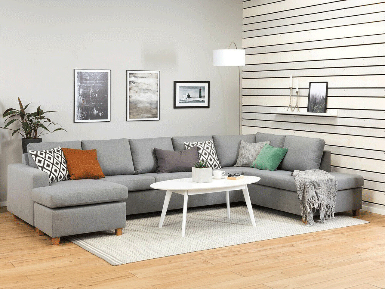 Når du ser på sofaen forfra, vil den forlængede del af højre-varianten være på din højre side. Den valgte hjørnevariant bør forbedre rummets flow og gøre det let at bevæge sig rundt i rummet.