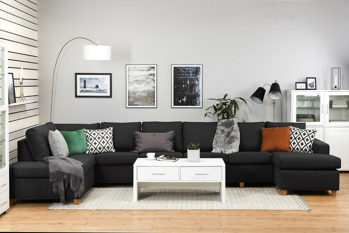 Når du ser på sofaen forfra, vil den forlængede del af venstre-varianten være på din venstre side. Den valgte hjørnevariant bør forbedre rummets flow og gøre det let at bevæge sig rundt i rummet.