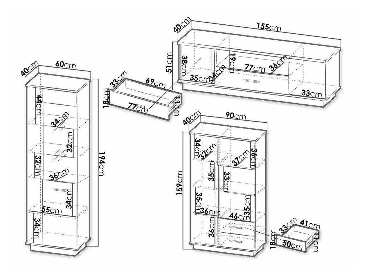 159 x 90 x 40; 194 x 60 x 40 cm