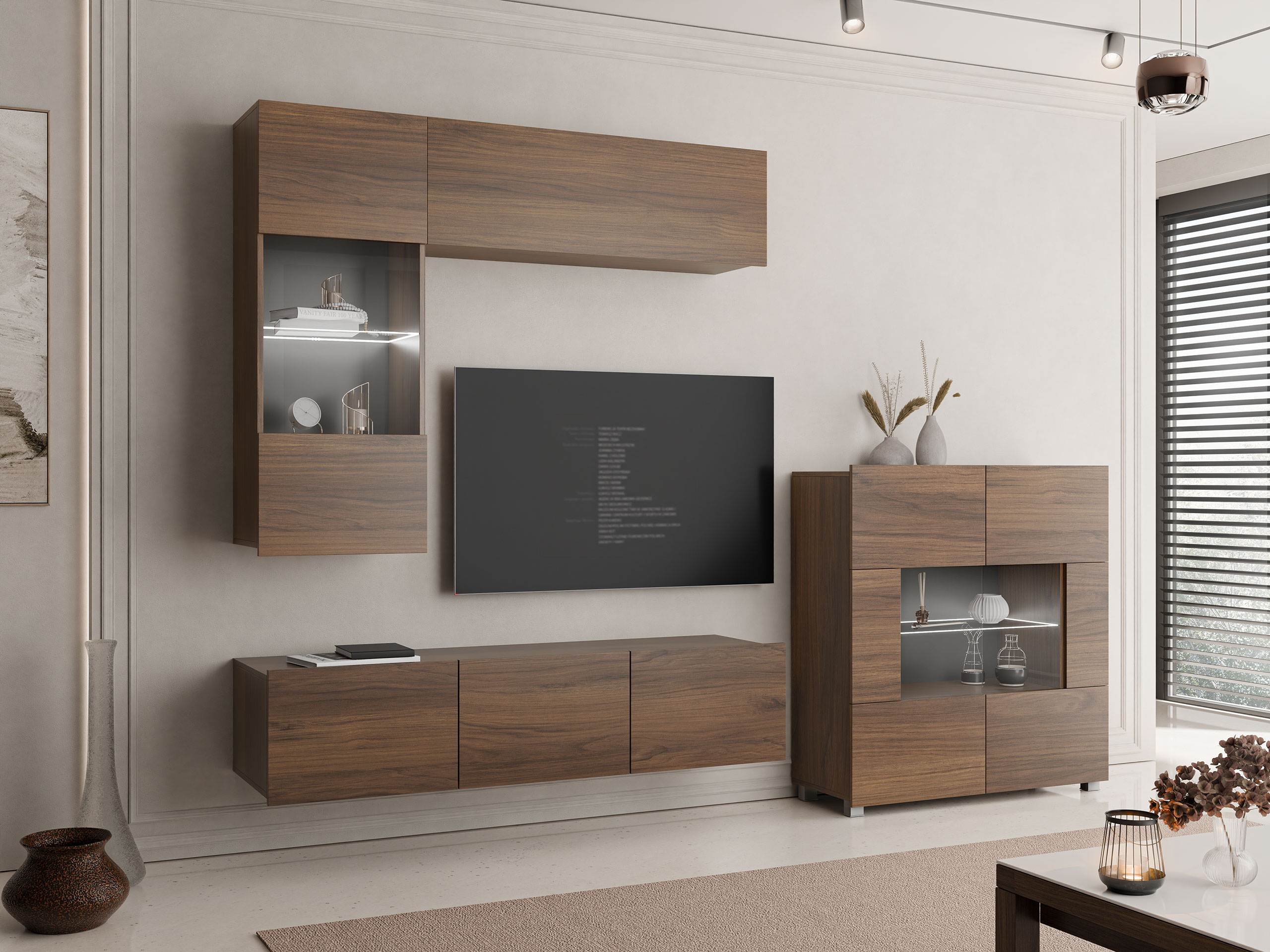 Denne møbelserie er designet til det moderne livs rytme, hvor funktionalitet og æstetik går hånd i hånd. Rene linjer, moderne former og subtile detaljer gør det nemt at skabe et hyggeligt, autentisk rum, som du vil nyde at komme hjem til. Kollektionen omfatter tv-møbler, stuesæt, vægmonterede skabe, senge og skriveborde – alt sammen omhyggeligt designet til at passe perfekt sammen. Disse møbler tilpasser sig nemt til forskellige interiører og tilbyder alsidige løsninger til kompakte rum eller danner dristige, markante kombinationer i større rum. Nogle modeller har integreret energieffektiv LED-belysning, der tilføjer varme og stemning om aftenen. Elementer af hærdet glas forbedrer både holdbarhed og design og giver et raffineret præg af karakter. Denne kollektion passer nemt ind i en række forskellige interiører og er med til at skabe et indbydende og stilfuldt opholdsrum – et sted at samles, holde pause og bare nyde at være.