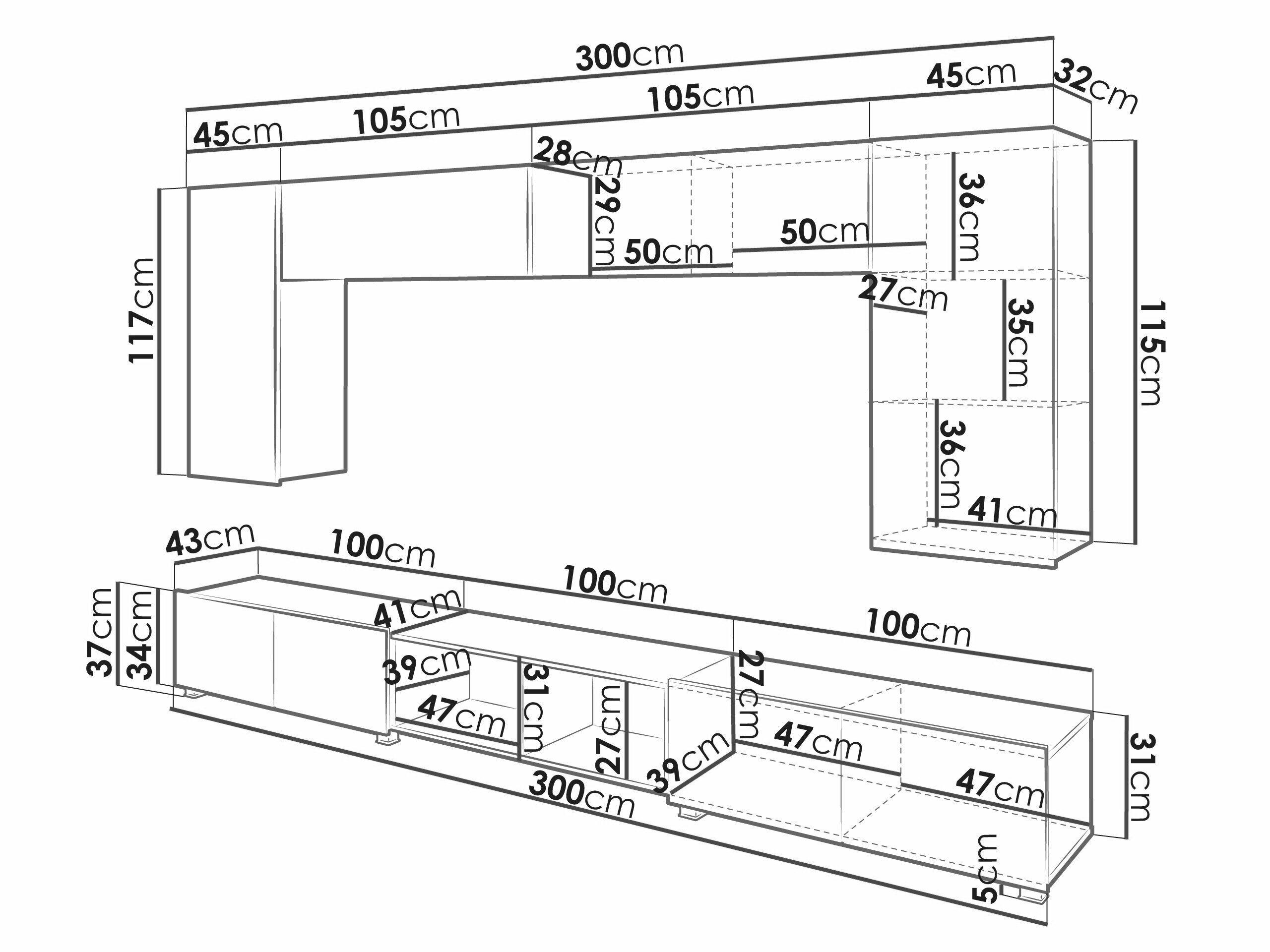 34 x 210 x 32; 117 x 45 x 32 cm