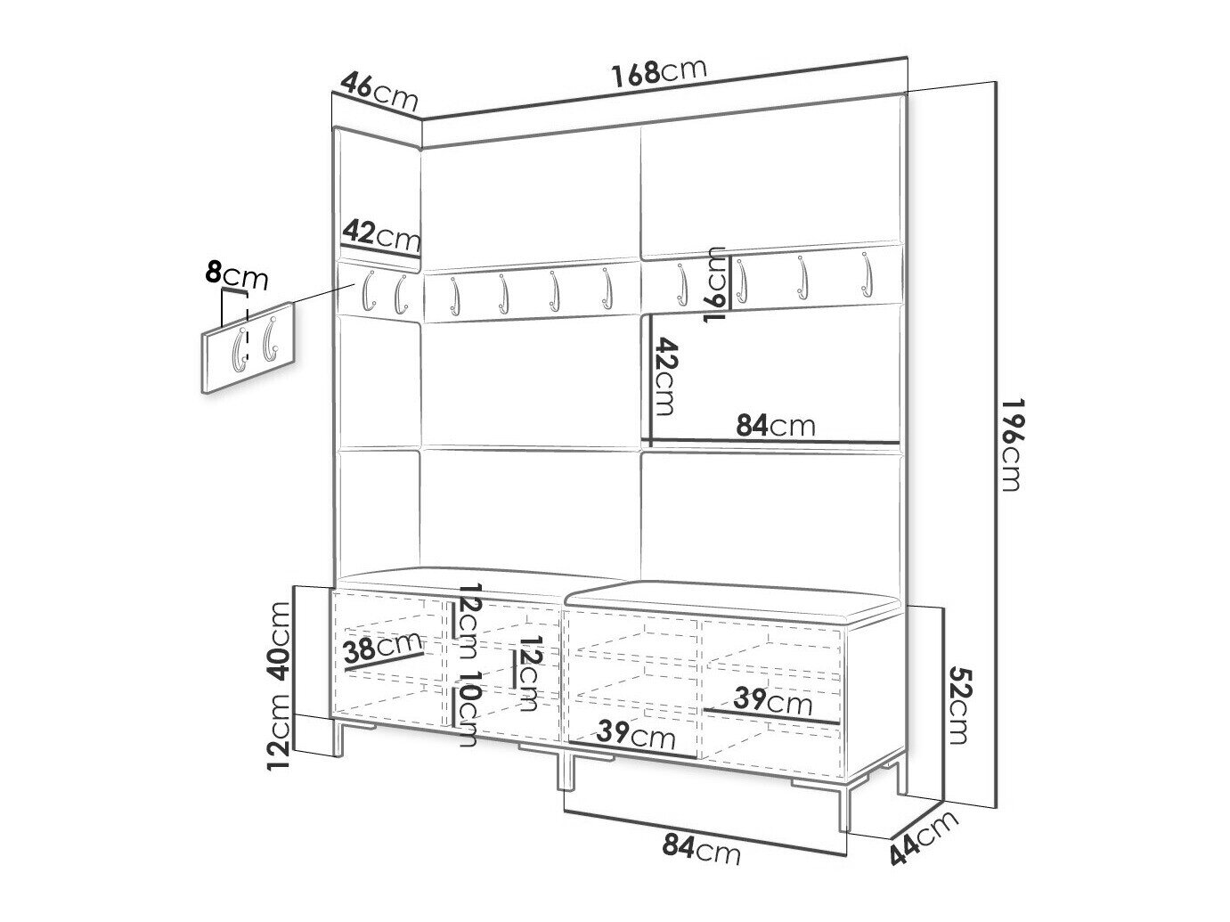 16 x 84 x 8; 16 x 42 x 8 cm