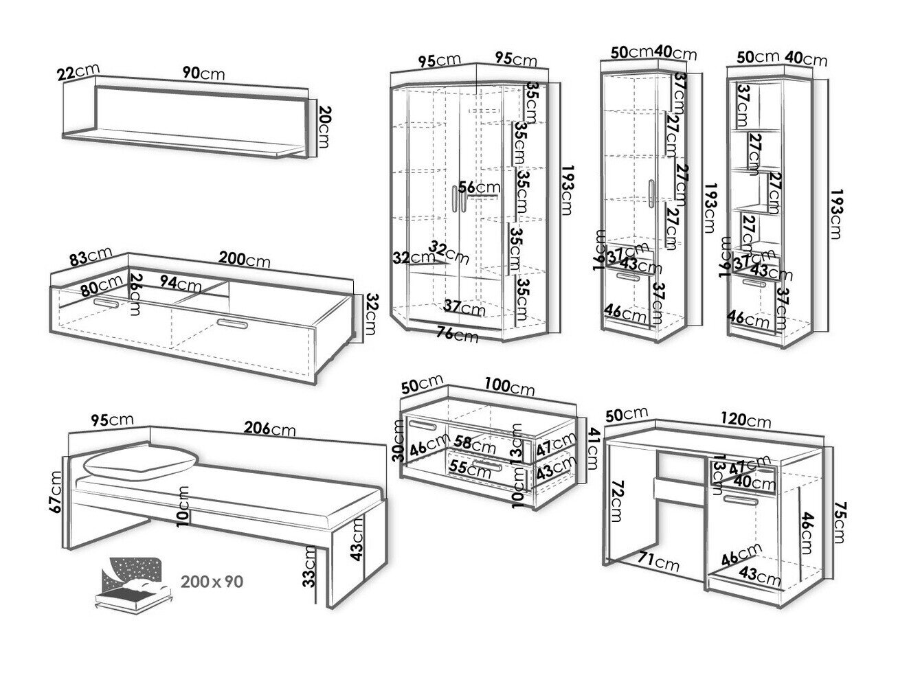 - 90 x 200 cm