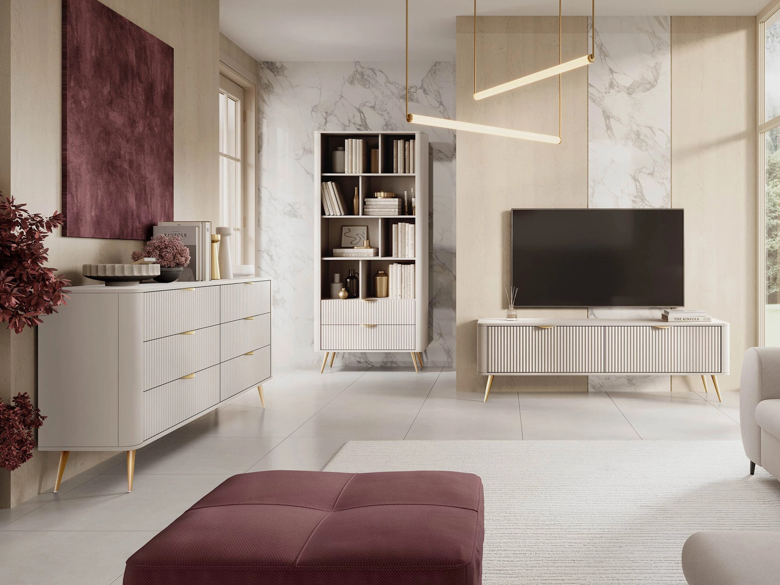 Når man indretter sit hjem, er der en stigende efterspørgsel efter møbler, der er funktionelle, nemme at kombinere med andre møbler og forbliver visuelt tiltalende i mange år fremover. Denne møbelkollektion er skabt med dette princip for øje. Subtile riller og lameldetaljer giver møblerne et karakteristisk udseende, samtidig med at det minimalistiske design passer perfekt ind i en række forskellige interiører. De høje metalben giver en visuel lethed og er perfekt egnet til hjem med robotstøvsugere – en praktisk løsning, der gør den daglige rengøring nemmere og hjælper med at opretholde et rent og organiseret rum. Takket være det unikke design passer denne kollektion smukt sammen med både moderne og moderne-klassiske interiører.