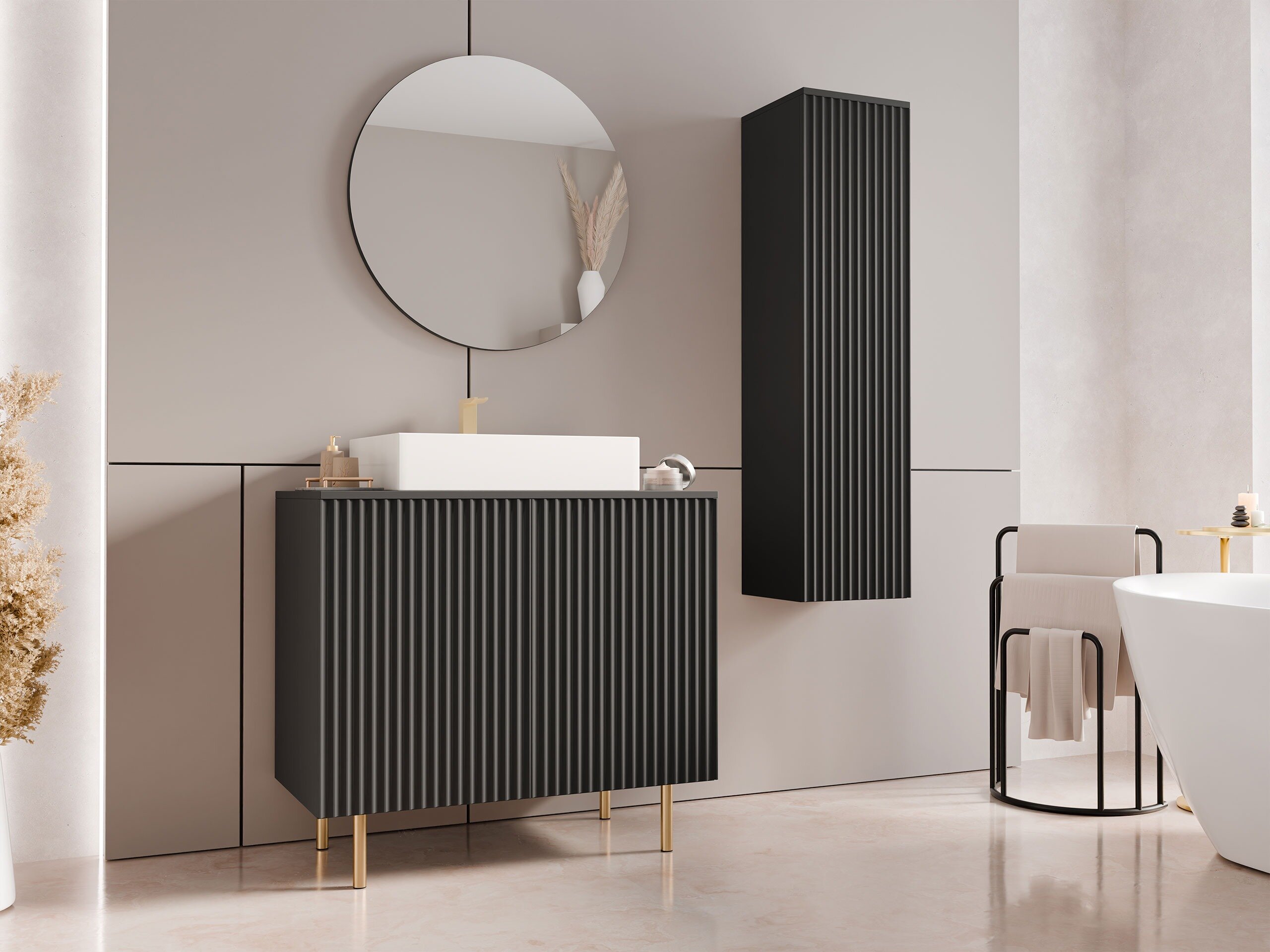 I indretningsdesign er det ofte detaljerne, der skaber en følelse af unikhed. Disse sidste finpudsninger giver rummet karakter og er med til at forvandle et hus til et hjem. Denne møbelkollektion er bygget på netop dette princip. Her kombineres subtil elegance med gennemtænkt funktionalitet, så du kan skabe et sammenhængende og harmonisk look på tværs af forskellige områder i hjemmet. Rillede og lamellerede overflader tilføjer en følelse af autenticitet til designet, mens guldfarvede metalhåndtag og diskrete touch-open-funktioner på udvalgte møbler er med til at bevare en ren, ensartet æstetik. De høje metalben er designet til at rumme robotstøvsugere, og en kombination af åben og lukket opbevaring sikrer et nemt og organiseret liv. Denne kollektion passer perfekt ind i moderne klassiske interiører og bliver et subtilt, men alligevel slående accent i hjemmet.