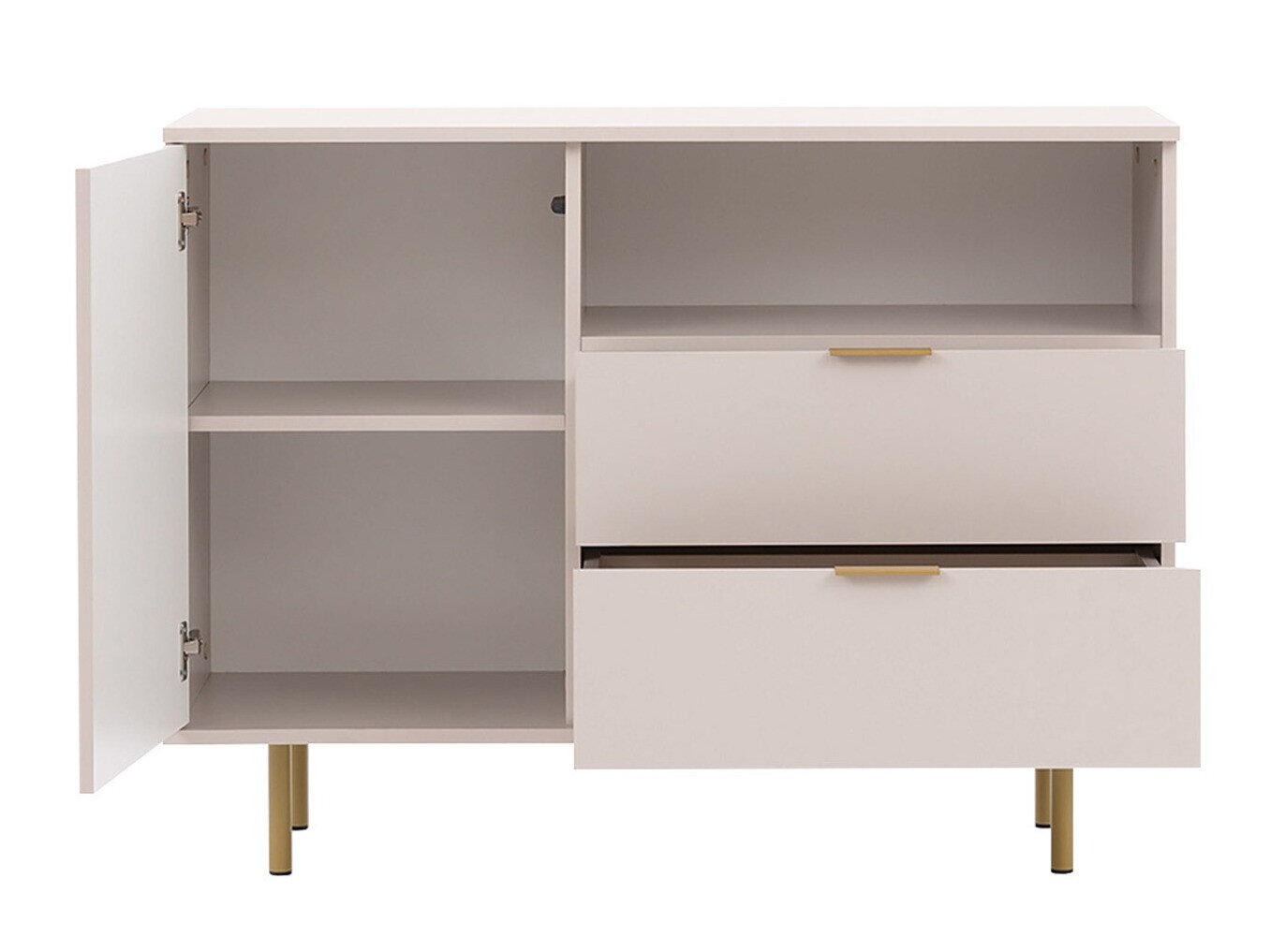 Åbn døre og skuffer med et enkelt tryk. "Push to open"-systemet består af en kombination af en fjeder og en magnetisk mekanisme til at trykke og holde døren. Også hængsler med særlige trykfjedre til at åbne døren. Takket være denne mekanisme har møblerne ikke brug for håndtag. Du kan åbne og lukke døre og skuffer med et enkelt klik.