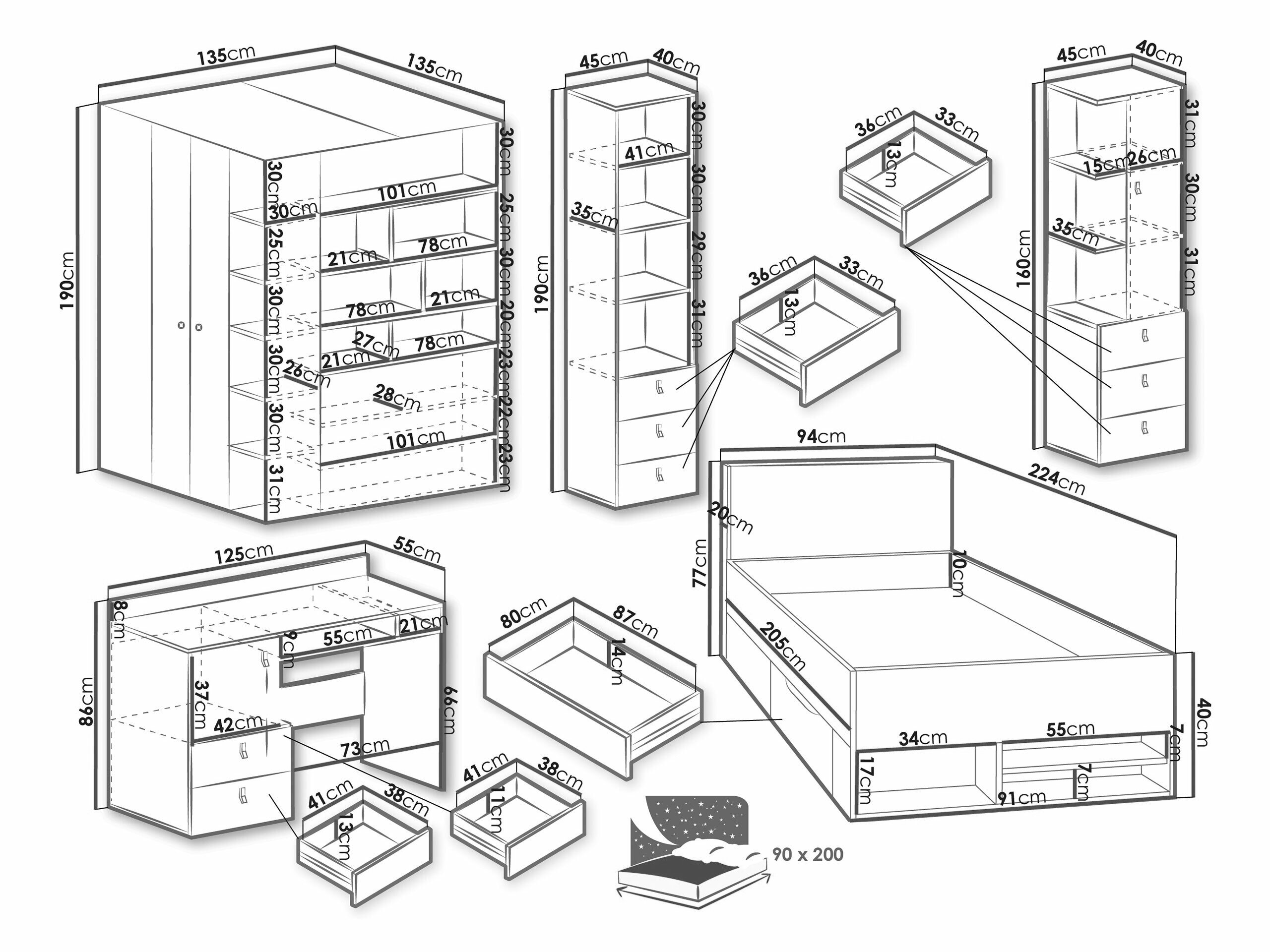 190 x 45 x 40; 160 x 45 x 40 cm