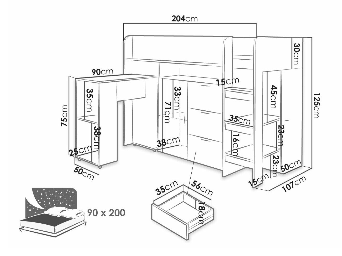 - 90 x 200 cm