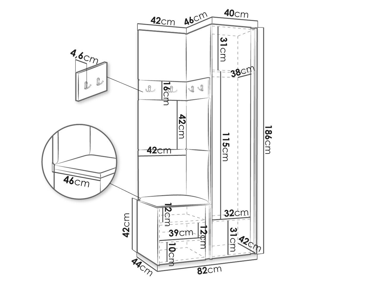 186 cm  42 cm  46 cm