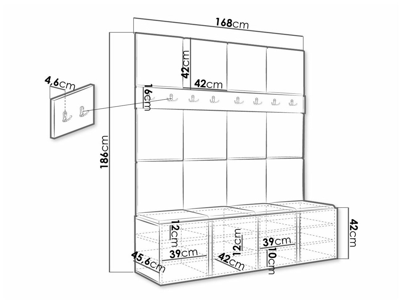 186 cm  168 cm  45.6 cm