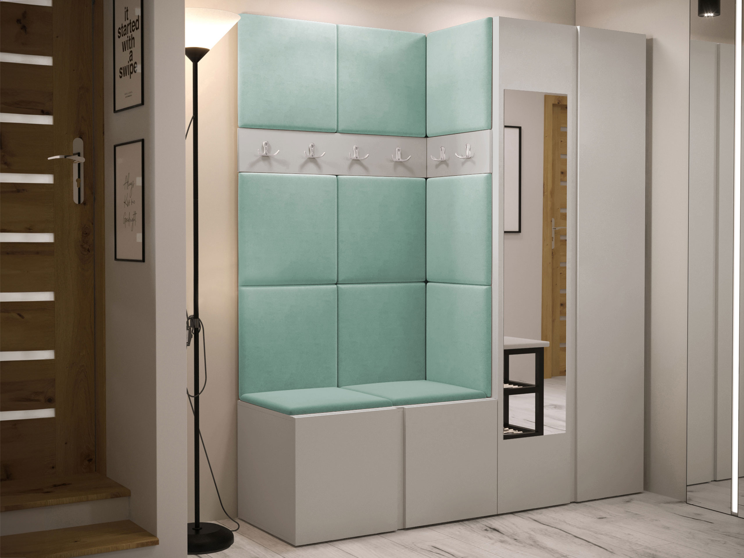 Blødt vægpanel, et elegant og funktionelt valg til dit hjem. Takket være den hævede overflade skaber panelet en unik 3D-effekt. Disse bløde paneler vil give mere hygge og komfort, og de vil desuden se ud som et dekorativt element. På grund af deres unikke egenskaber absorberer de lyd. Brug panelerne som en separat rumfunktion eller til at dække hele væggen. Panelet består af en 8 mm tyk plade, som gør det nemmere at montere på væggen. Blødheden og formen sikres af et 3 cm tykt syntetisk stof og det materiale, der dækker det. Du kan vælge et panelstof fra en bred vifte af farver, så du er sikker på at finde det, der passer bedst til din boligindretning.