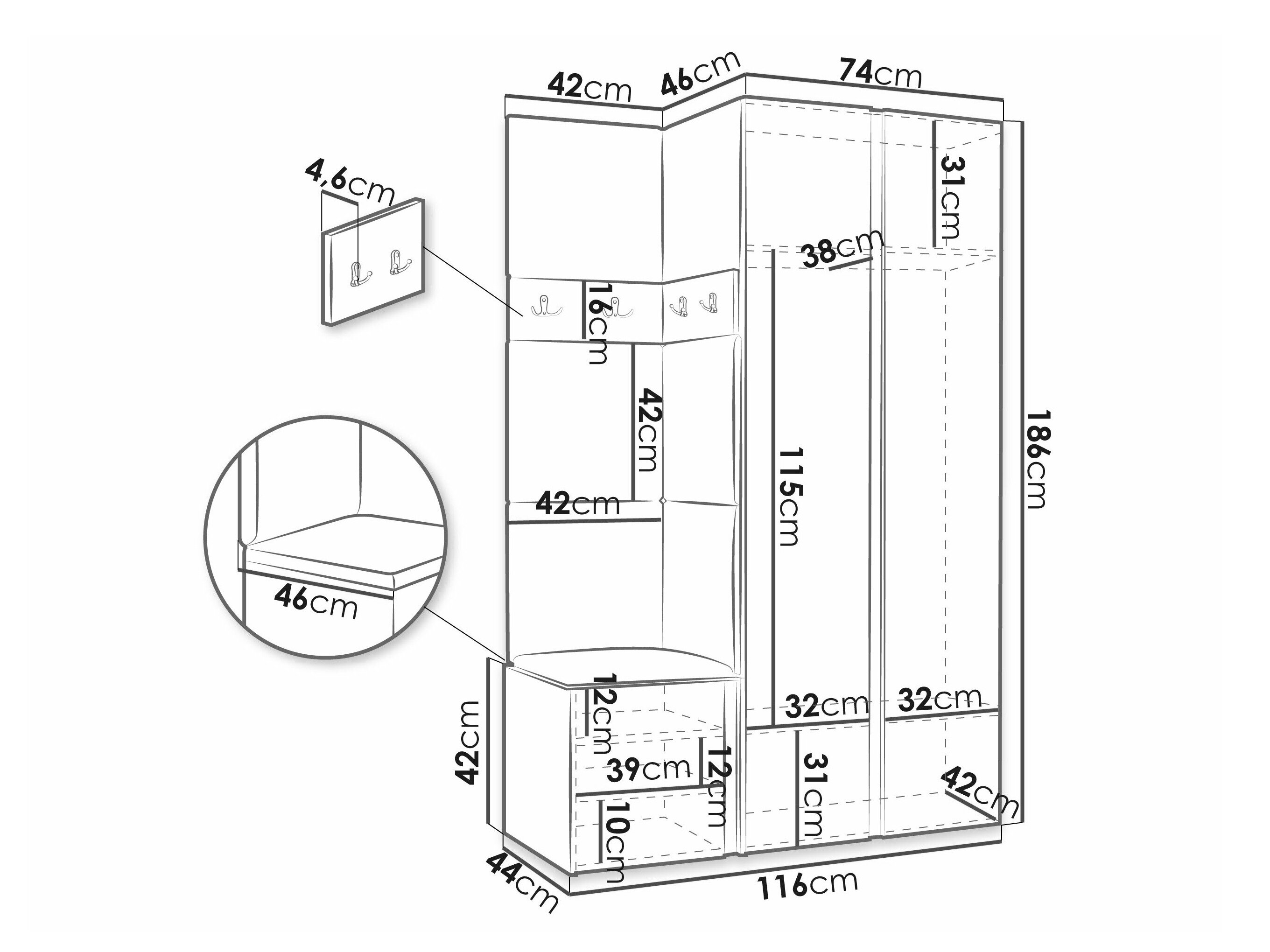 186 x 74 x 46 cm