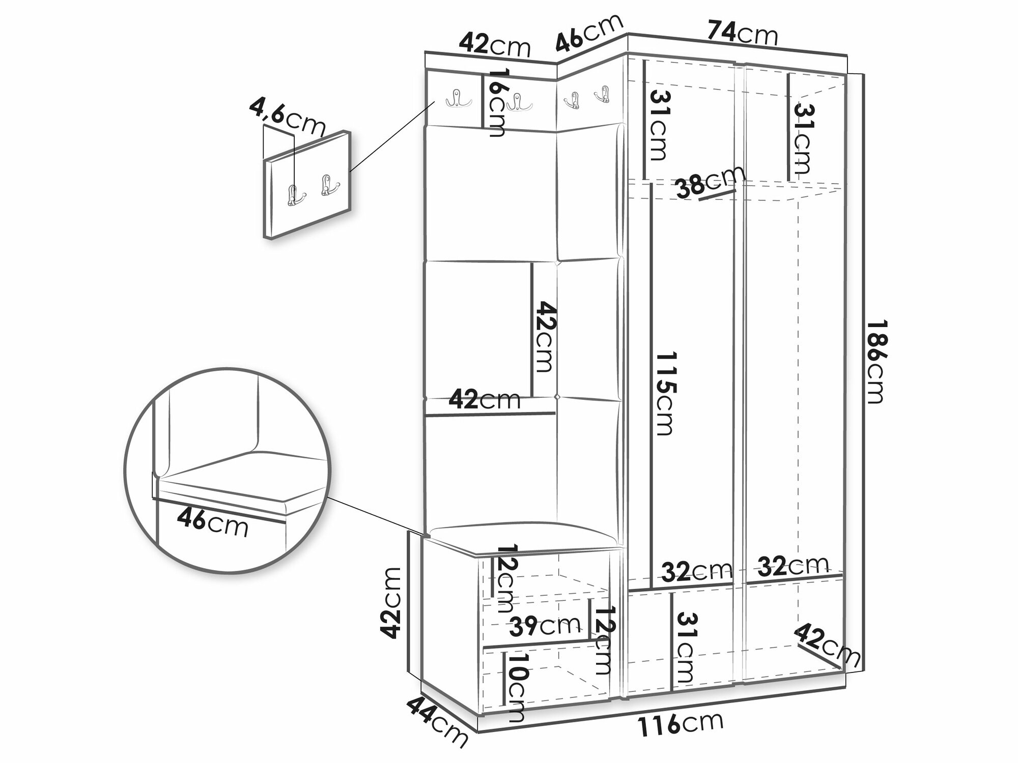 186 x 74 x 46 cm