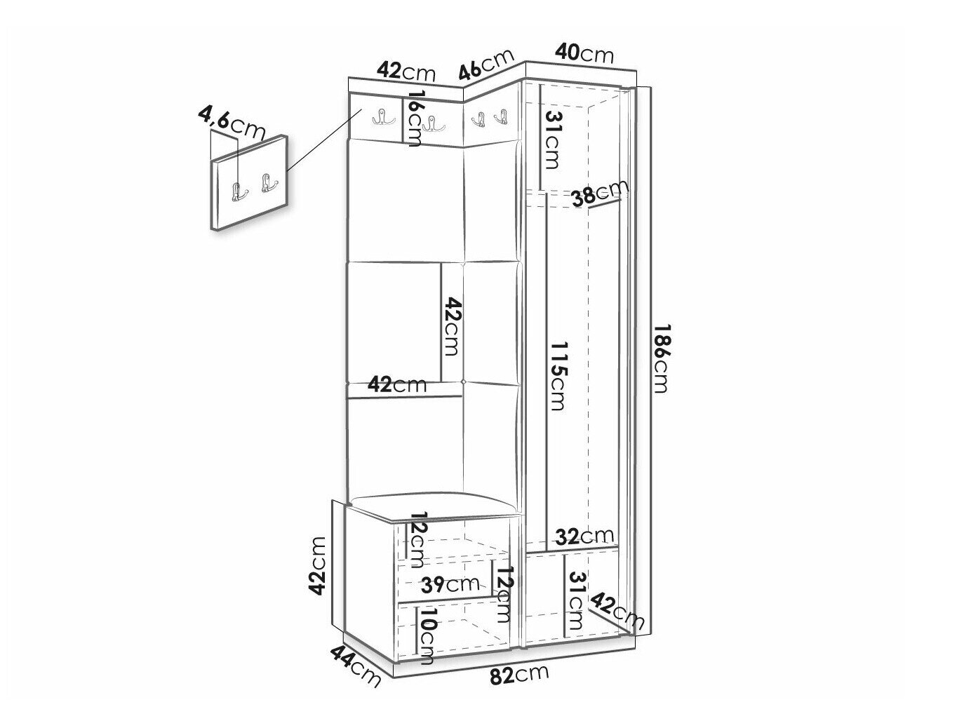 186 cm  42 cm  46 cm