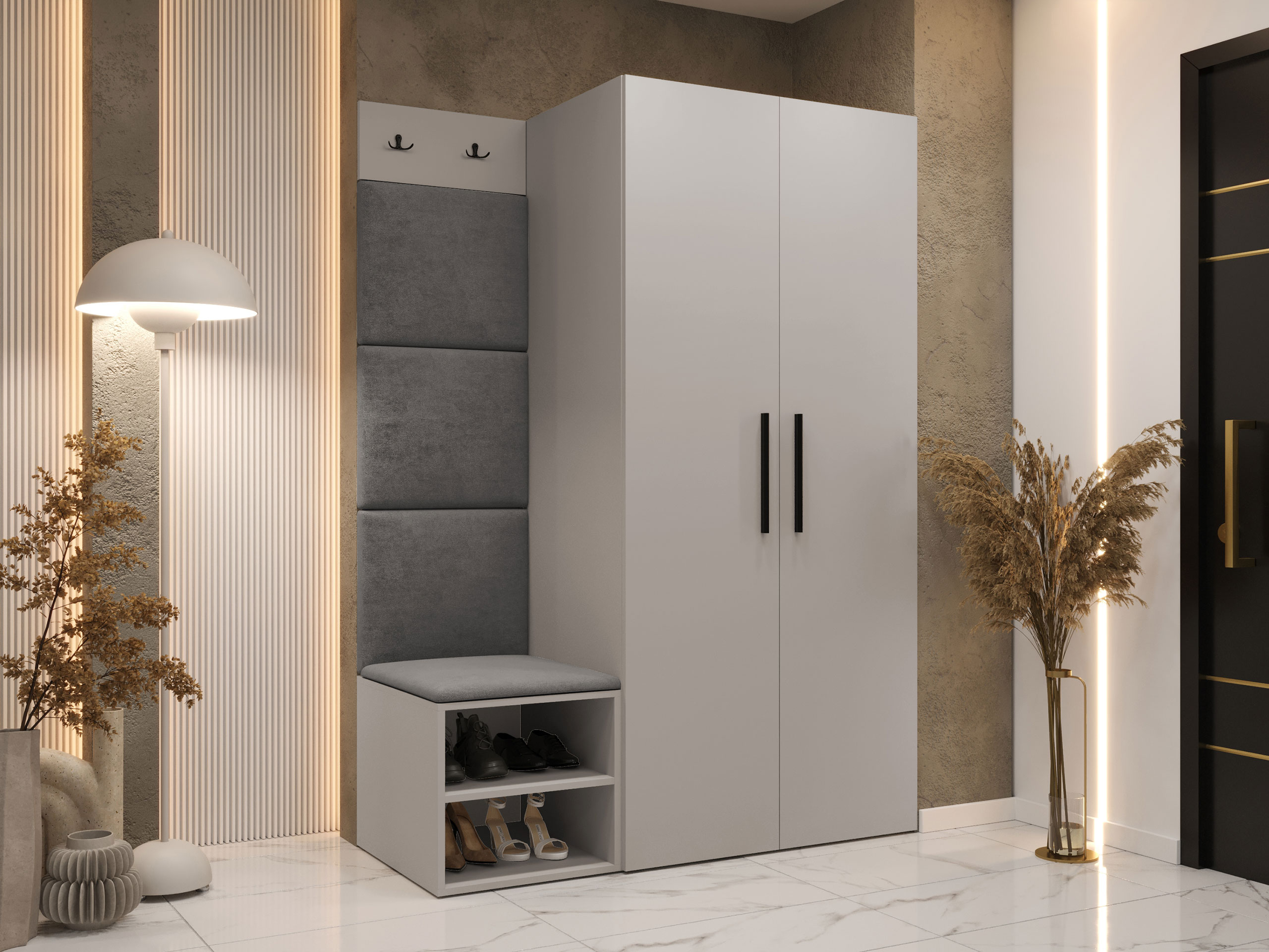 Blødt vægpanel, et elegant og funktionelt valg til dit hjem. Takket være den hævede overflade skaber panelet en unik 3D-effekt. Disse bløde paneler vil give mere hygge og komfort, og de vil desuden se ud som et dekorativt element. På grund af deres unikke egenskaber absorberer de lyd. Brug panelerne som en separat rumfunktion eller til at dække hele væggen. Panelet består af en 8 mm tyk plade, som gør det nemmere at montere på væggen. Blødheden og formen sikres af et 3 cm tykt syntetisk stof og det materiale, der dækker det. Du kan vælge et panelstof fra en bred vifte af farver, så du er sikker på at finde det, der passer bedst til din boligindretning.
