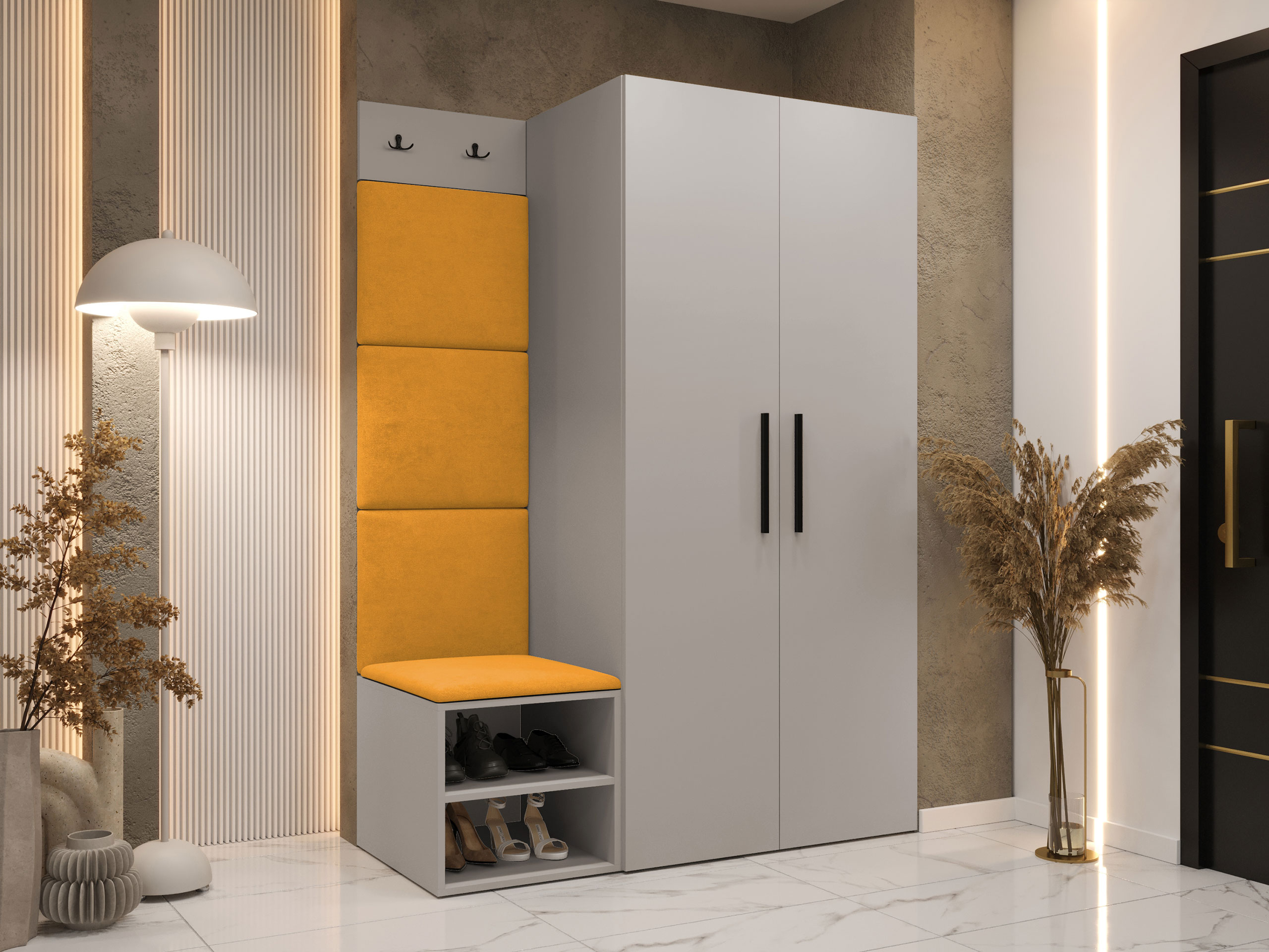 Blødt vægpanel, et elegant og funktionelt valg til dit hjem. Takket være den hævede overflade skaber panelet en unik 3D-effekt. Disse bløde paneler vil give mere hygge og komfort, og de vil desuden se ud som et dekorativt element. På grund af deres unikke egenskaber absorberer de lyd. Brug panelerne som en separat rumfunktion eller til at dække hele væggen. Panelet består af en 8 mm tyk plade, som gør det nemmere at montere på væggen. Blødheden og formen sikres af et 3 cm tykt syntetisk stof og det materiale, der dækker det. Du kan vælge et panelstof fra en bred vifte af farver, så du er sikker på at finde det, der passer bedst til din boligindretning.