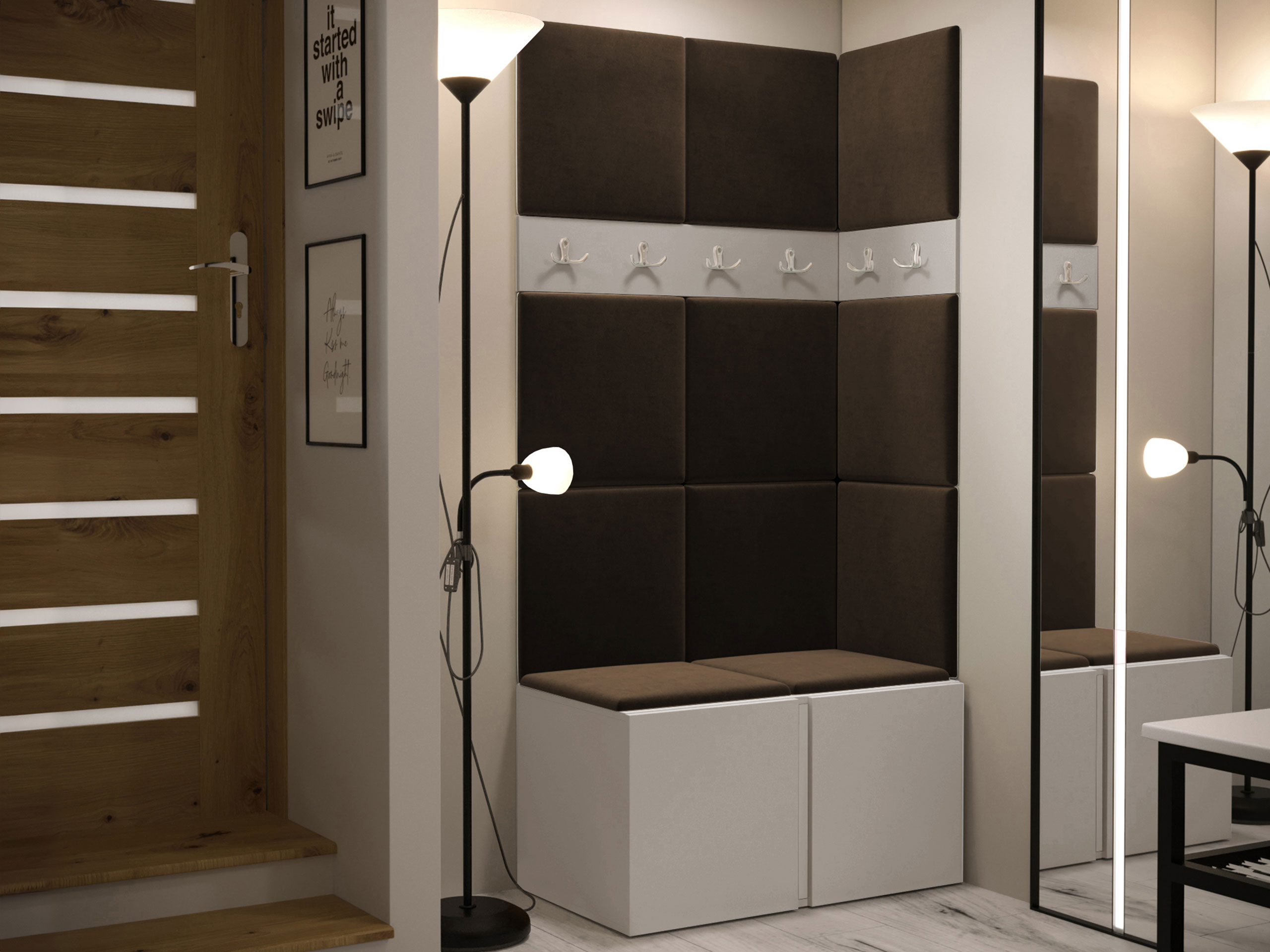 Blødt vægpanel, et elegant og funktionelt valg til dit hjem. Takket være den hævede overflade skaber panelet en unik 3D-effekt. Disse bløde paneler vil give mere hygge og komfort, og de vil desuden se ud som et dekorativt element. På grund af deres unikke egenskaber absorberer de lyd. Brug panelerne som en separat rumfunktion eller til at dække hele væggen. Panelet består af en 8 mm tyk plade, som gør det nemmere at montere på væggen. Blødheden og formen sikres af et 3 cm tykt syntetisk stof og det materiale, der dækker det. Du kan vælge et panelstof fra en bred vifte af farver, så du er sikker på at finde det, der passer bedst til din boligindretning.