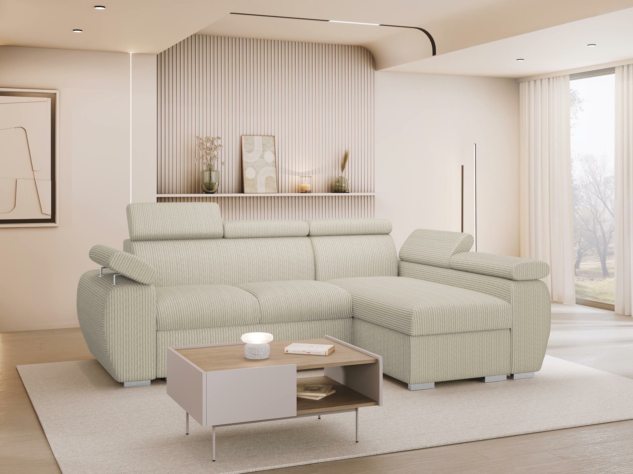 Når du ser på sofaen forfra, vil den forlængede del af højre-varianten være på din højre side. Den valgte hjørnevariant bør forbedre rummets flow og gøre det let at bevæge sig rundt i rummet.