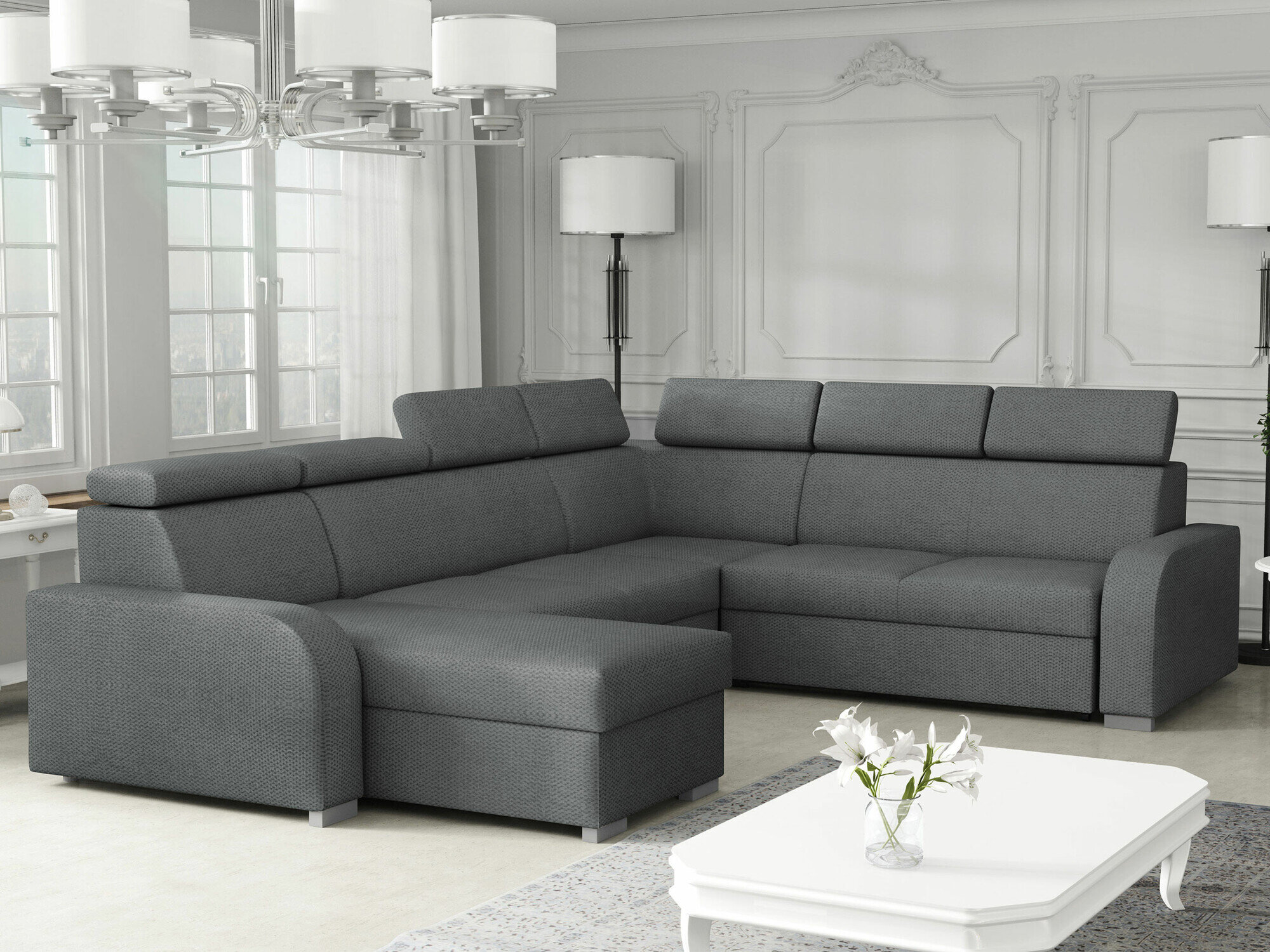 Stoffet på bagsiden af møblet er ikke anderledes end stoffet på hovedmøblet. Du kan placere møbler med denne funktion midt i rummet.