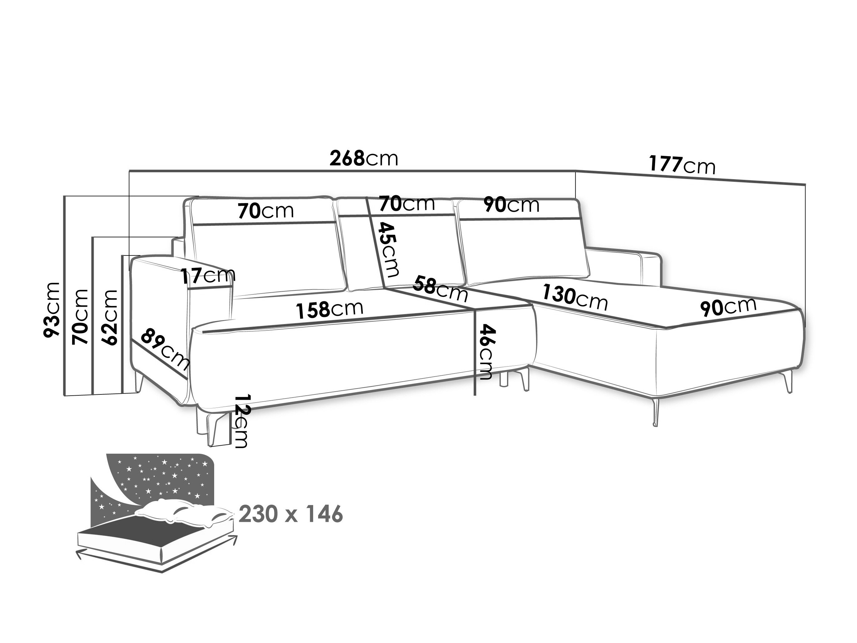 Når du ser på sofaen forfra, vil den forlængede del af venstre-varianten være på din venstre side. Den valgte hjørnevariant bør forbedre rummets flow og gøre det let at bevæge sig rundt i rummet.