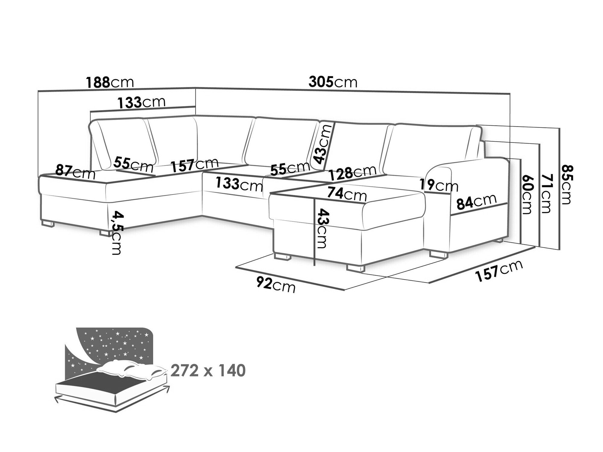 85 cm  305 cm  188 cm