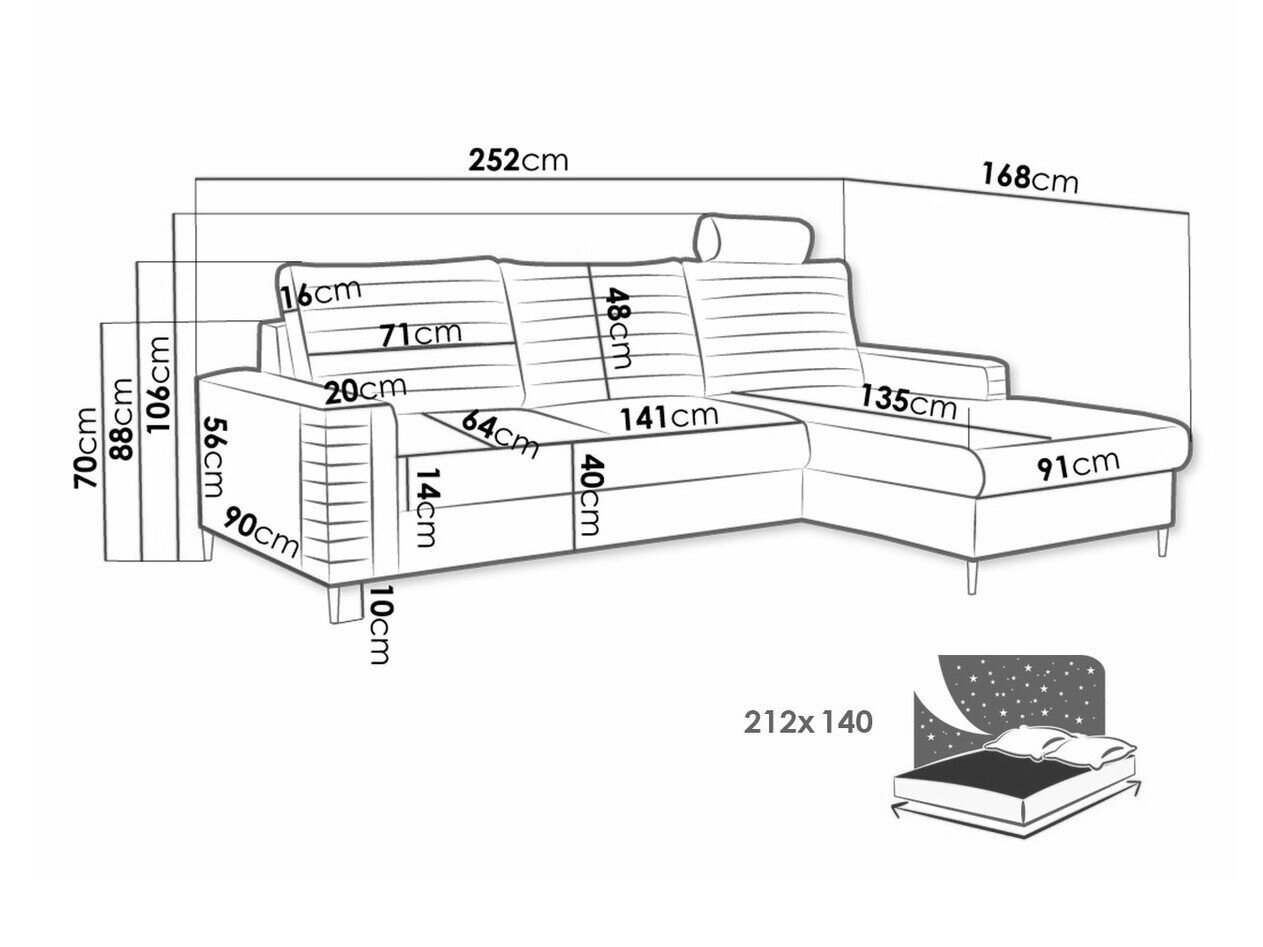 Når du ser på sofaen forfra, vil den forlængede del af venstre-varianten være på din venstre side. Den valgte hjørnevariant bør forbedre rummets flow og gøre det let at bevæge sig rundt i rummet.