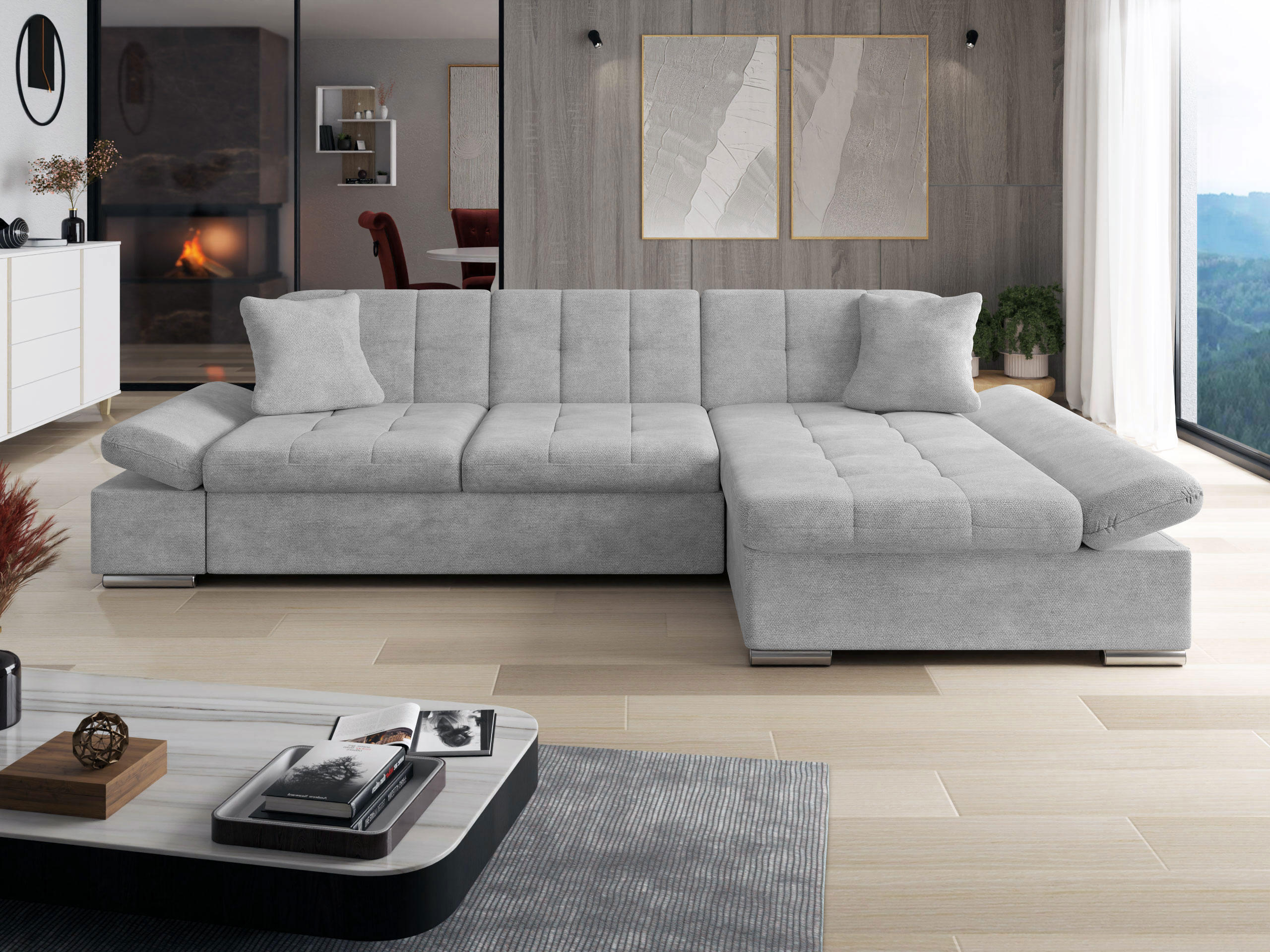 Når du ser på sofaen forfra, vil den forlængede del af højre-varianten være på din højre side. Den valgte hjørnevariant bør forbedre rummets flow og gøre det let at bevæge sig rundt i rummet.