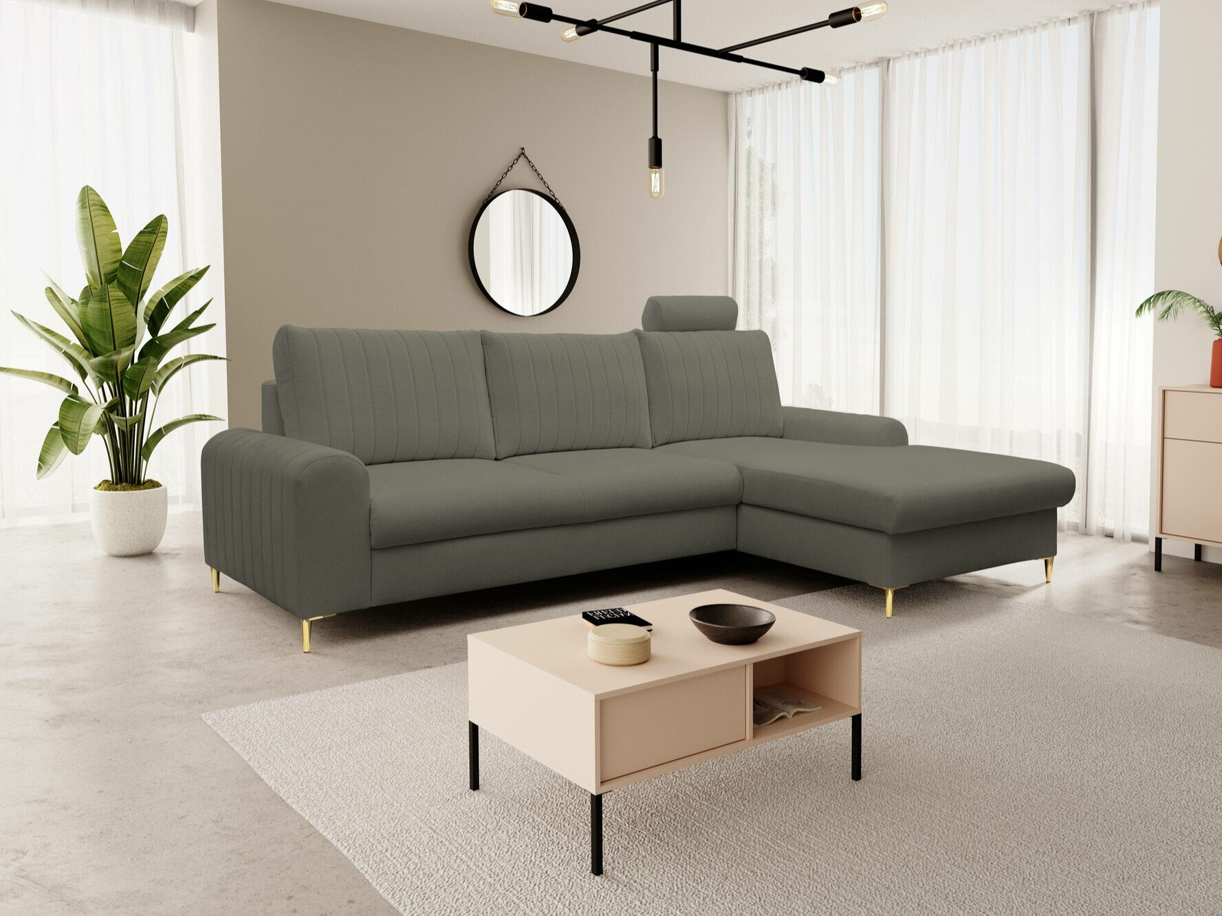 Når du ser på sofaen forfra, vil den forlængede del af højre-varianten være på din højre side. Den valgte hjørnevariant bør forbedre rummets flow og gøre det let at bevæge sig rundt i rummet.