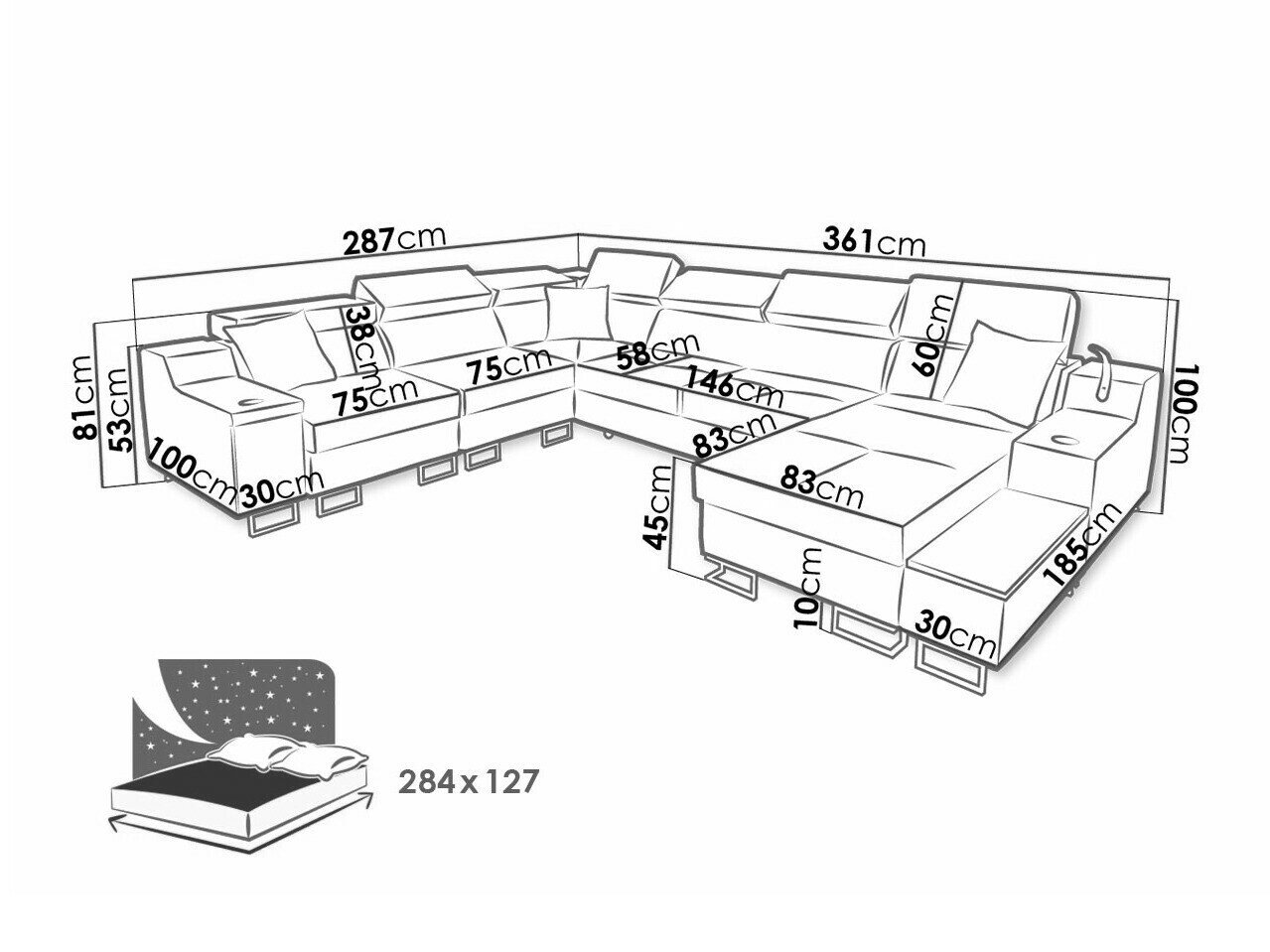 19 x 180 x 72; 19 x 97 x 72 cm