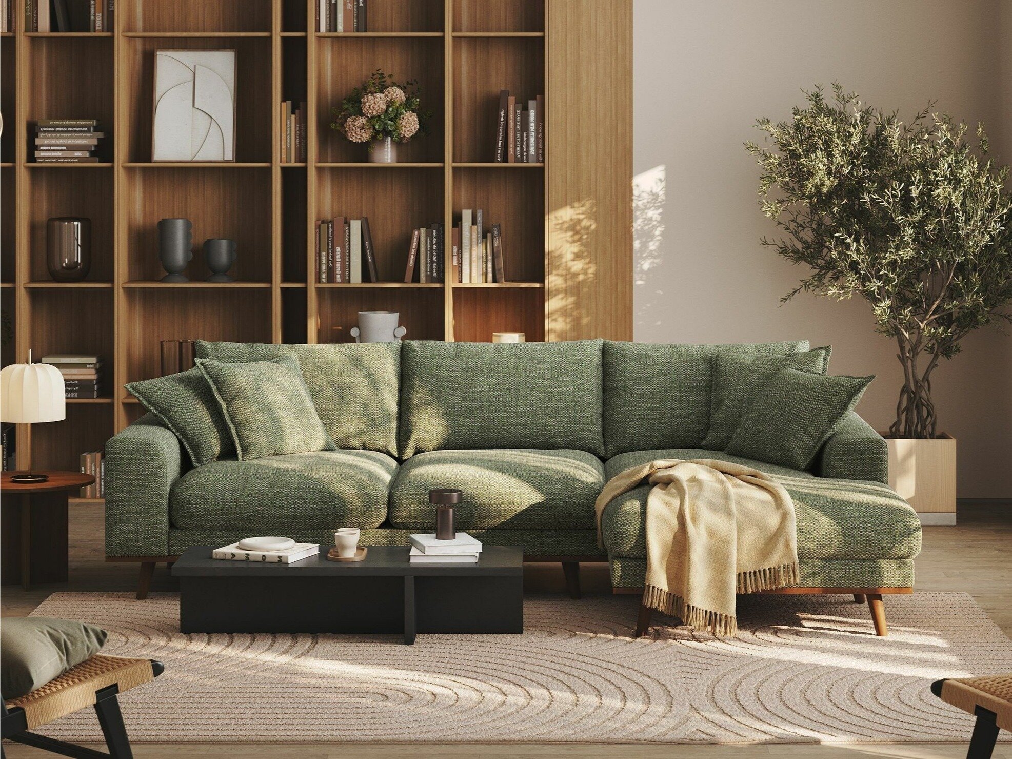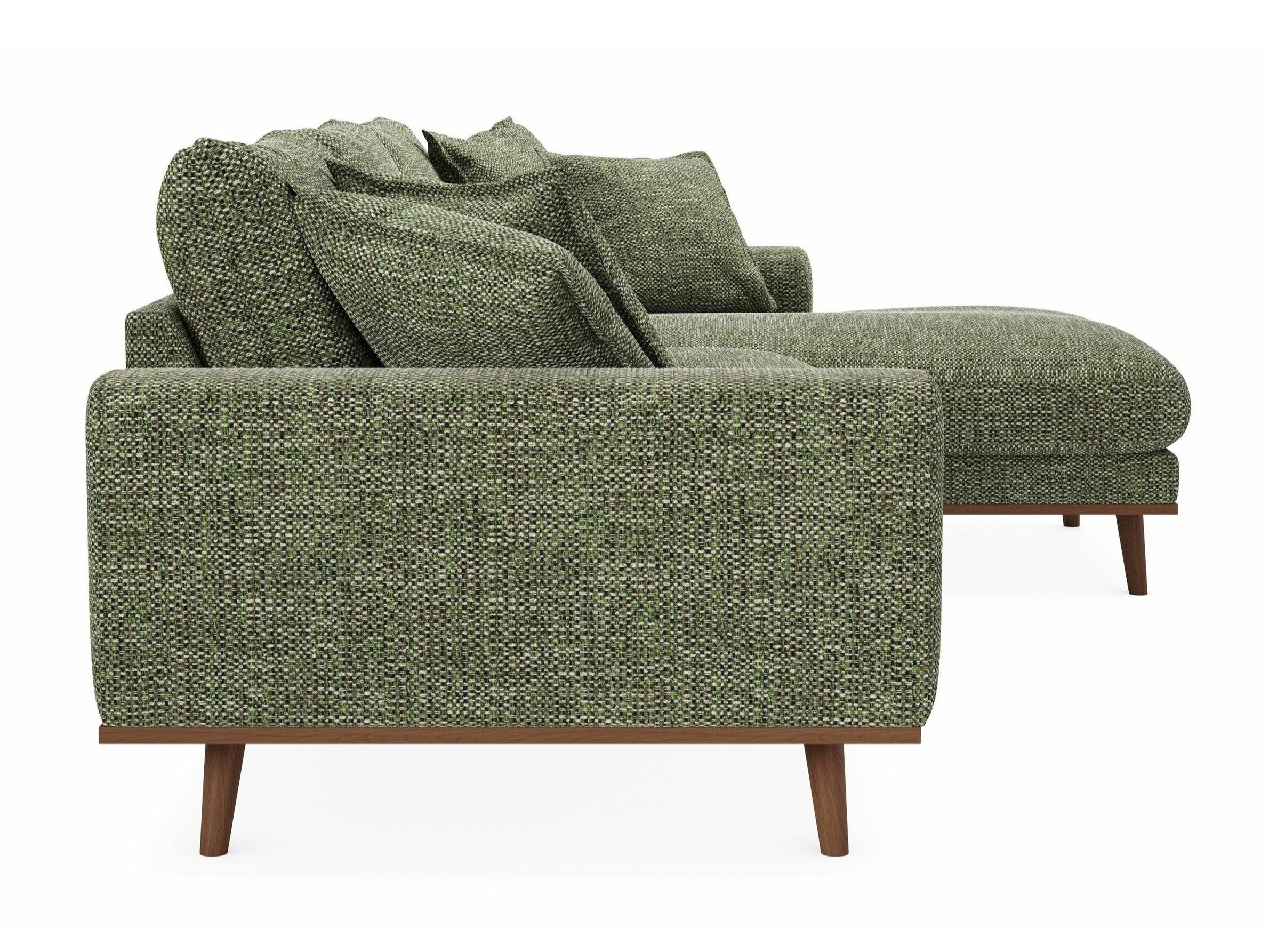 Når du ser på sofaen forfra, vil den forlængede del af højre-varianten være på din højre side. Den valgte hjørnevariant bør forbedre rummets flow og gøre det let at bevæge sig rundt i rummet.