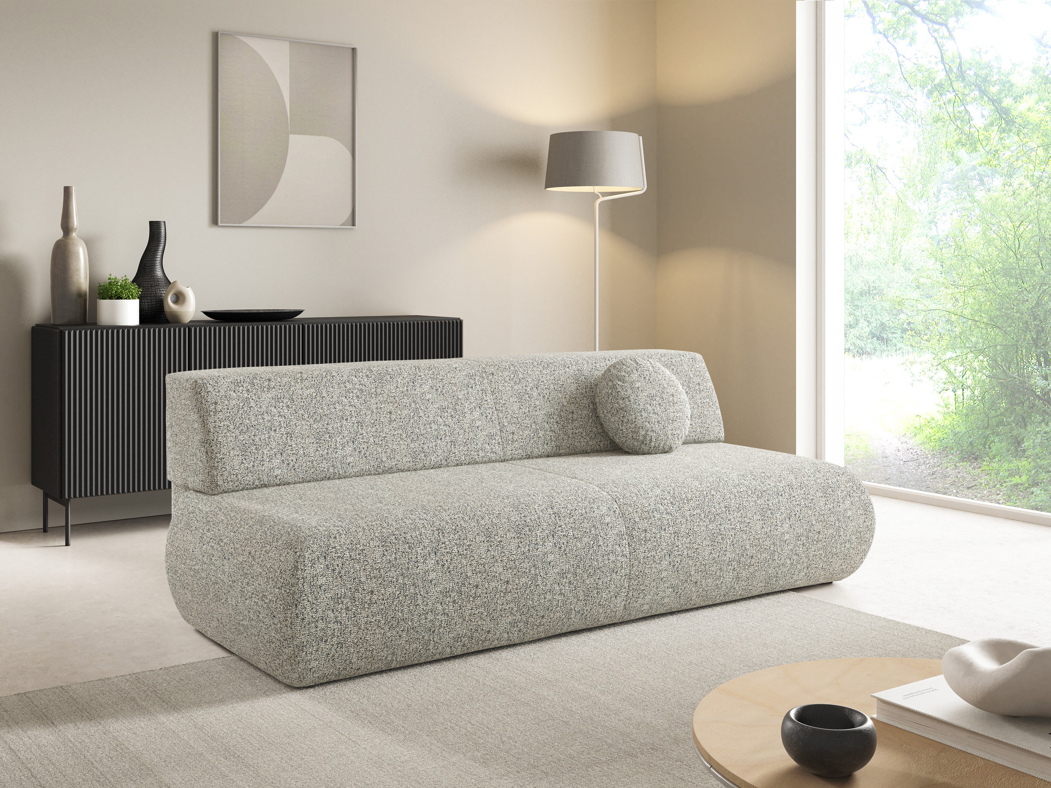 Stoffet på bagsiden af møblet er ikke anderledes end stoffet på hovedmøblet. Du kan placere møbler med denne funktion midt i rummet.