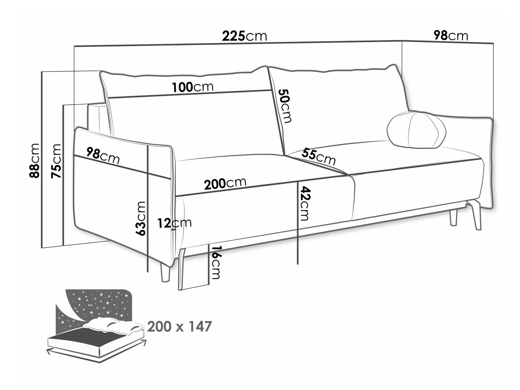 88 cm  225 cm  98 cm