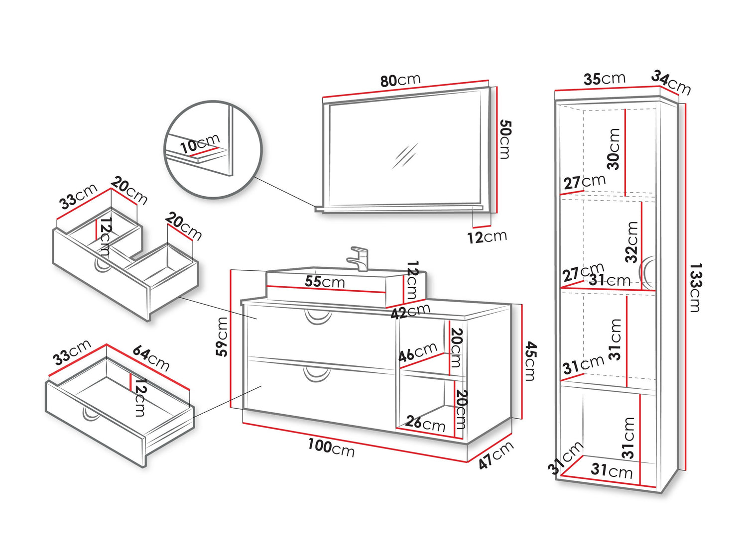 Hængende skabs dimensioner133 x 35 x 34 cm