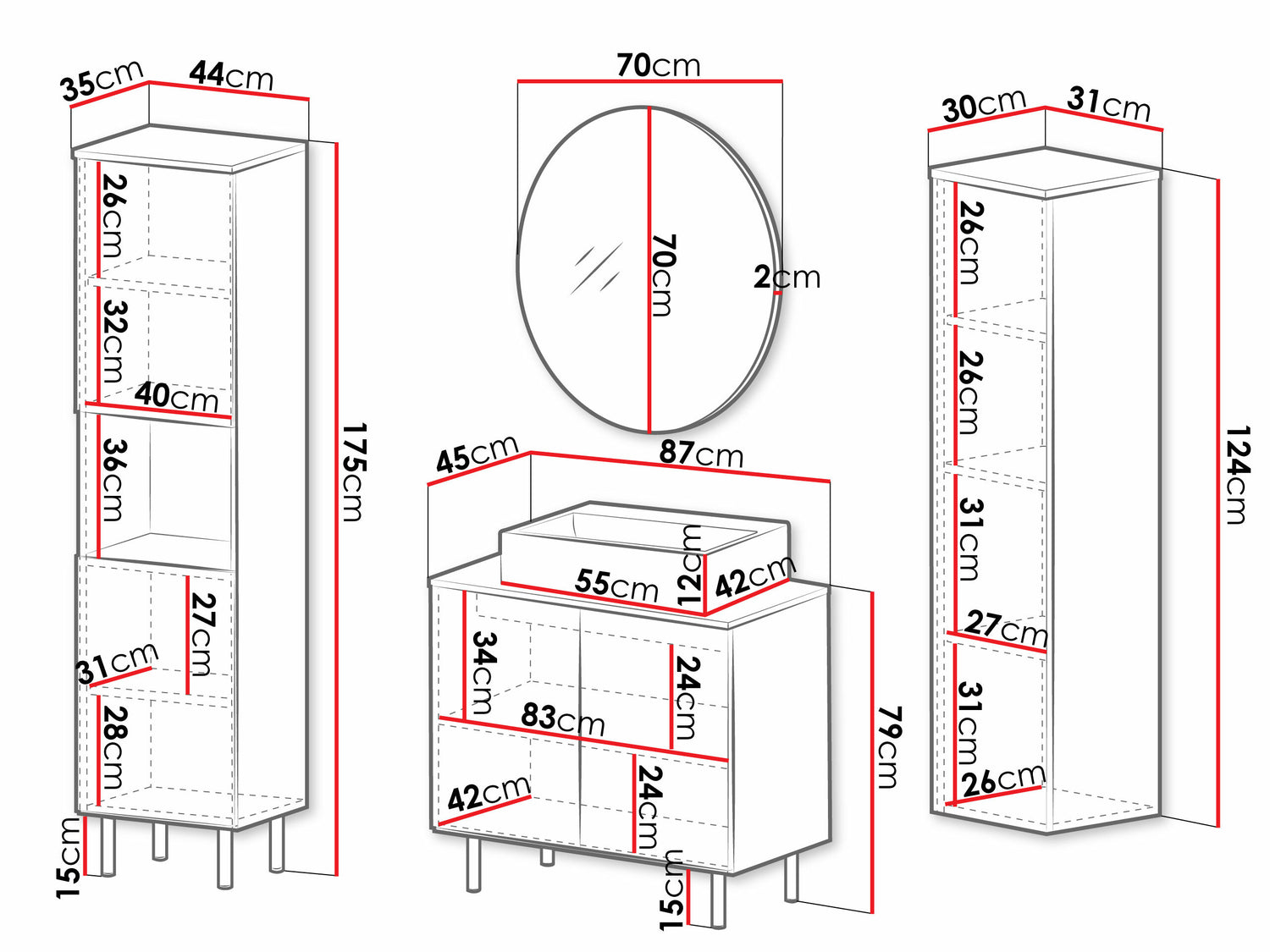 Hængende skabs dimensioner124 x 31 x 30 cm
