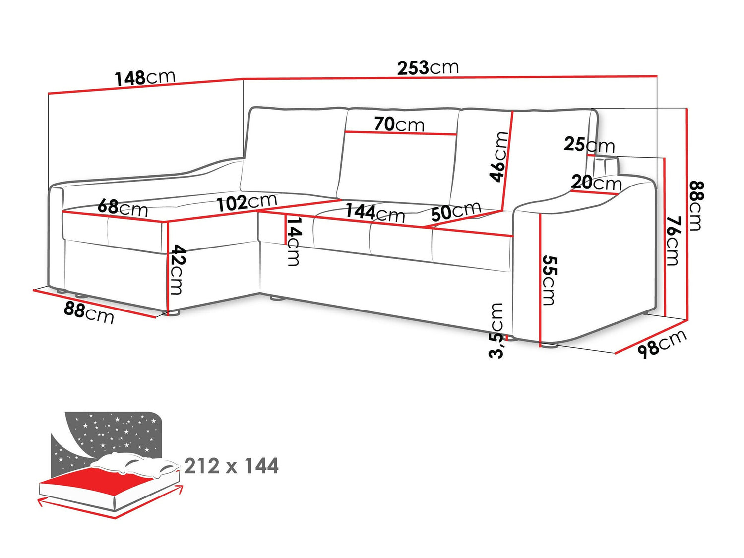 Længde på soveområde212 cm