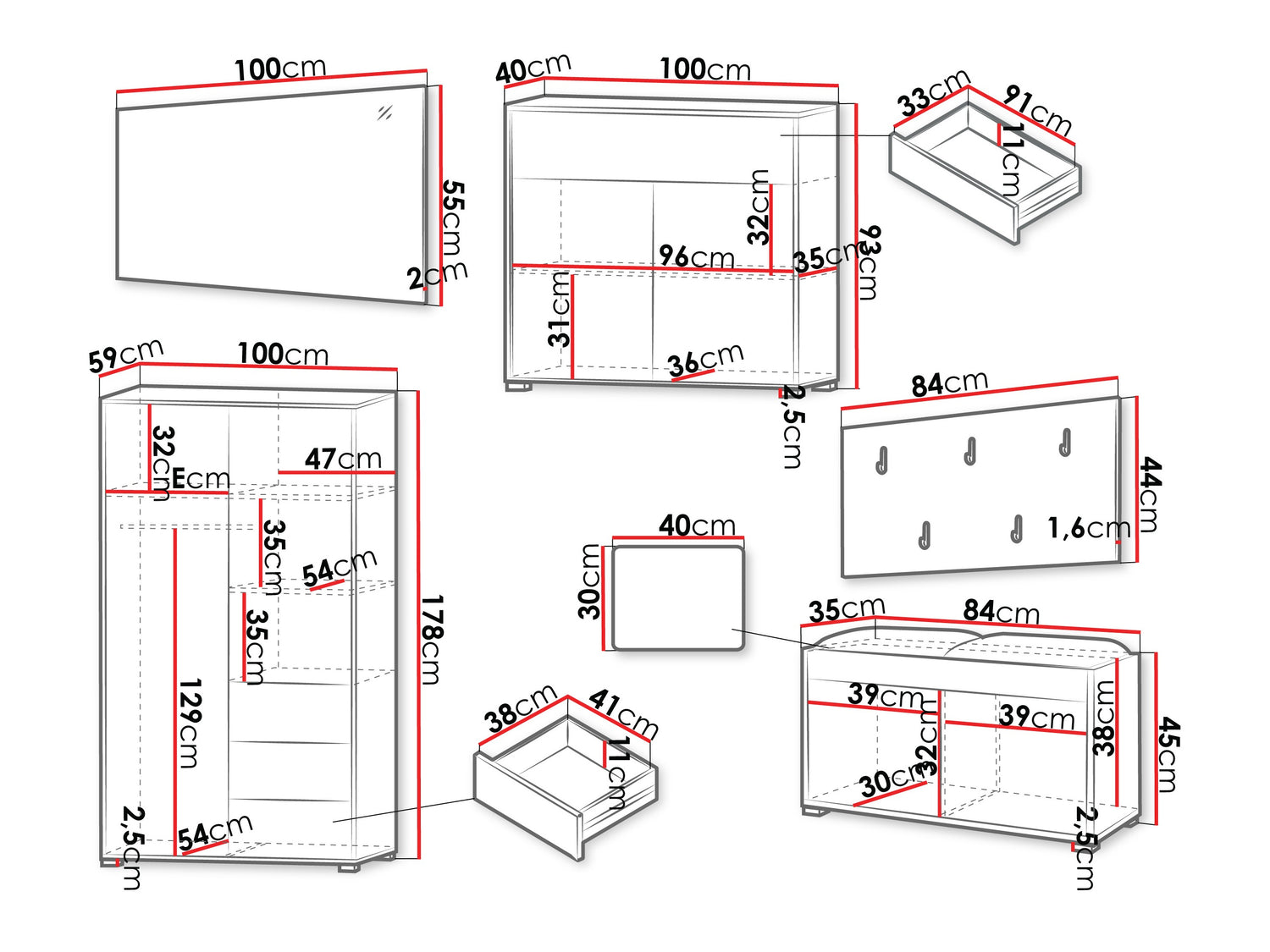 Dimensioner på garderobeskabe178 x 100 x 59 cm