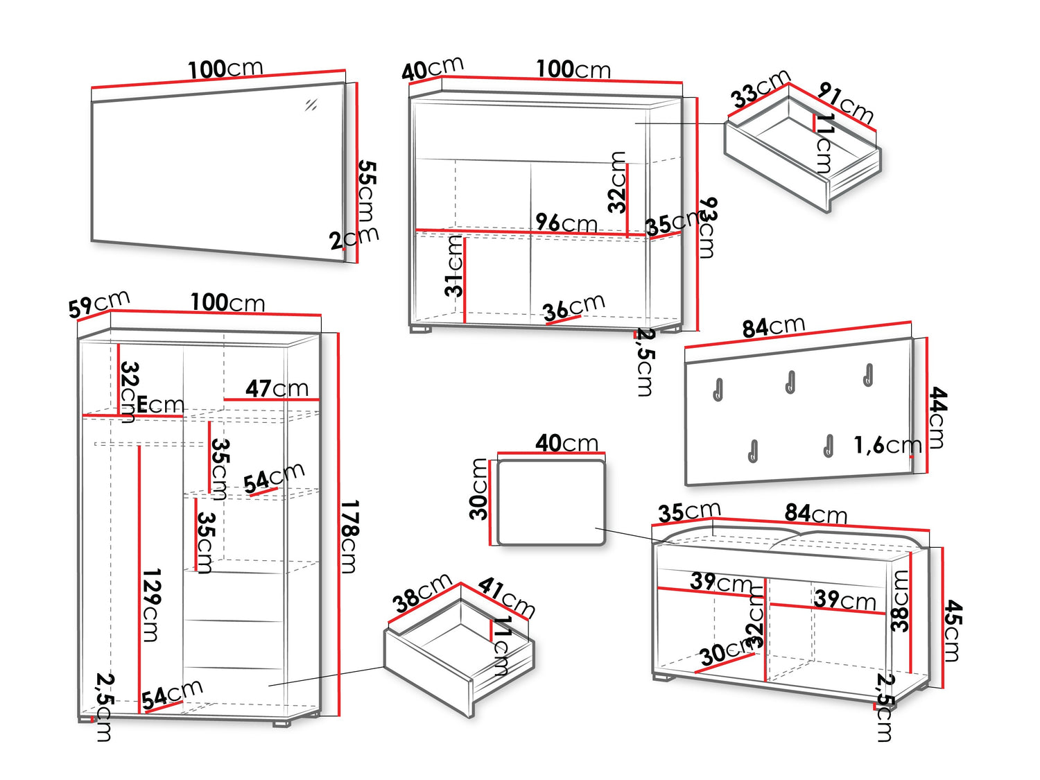• Dimensioner på garderobeskabe