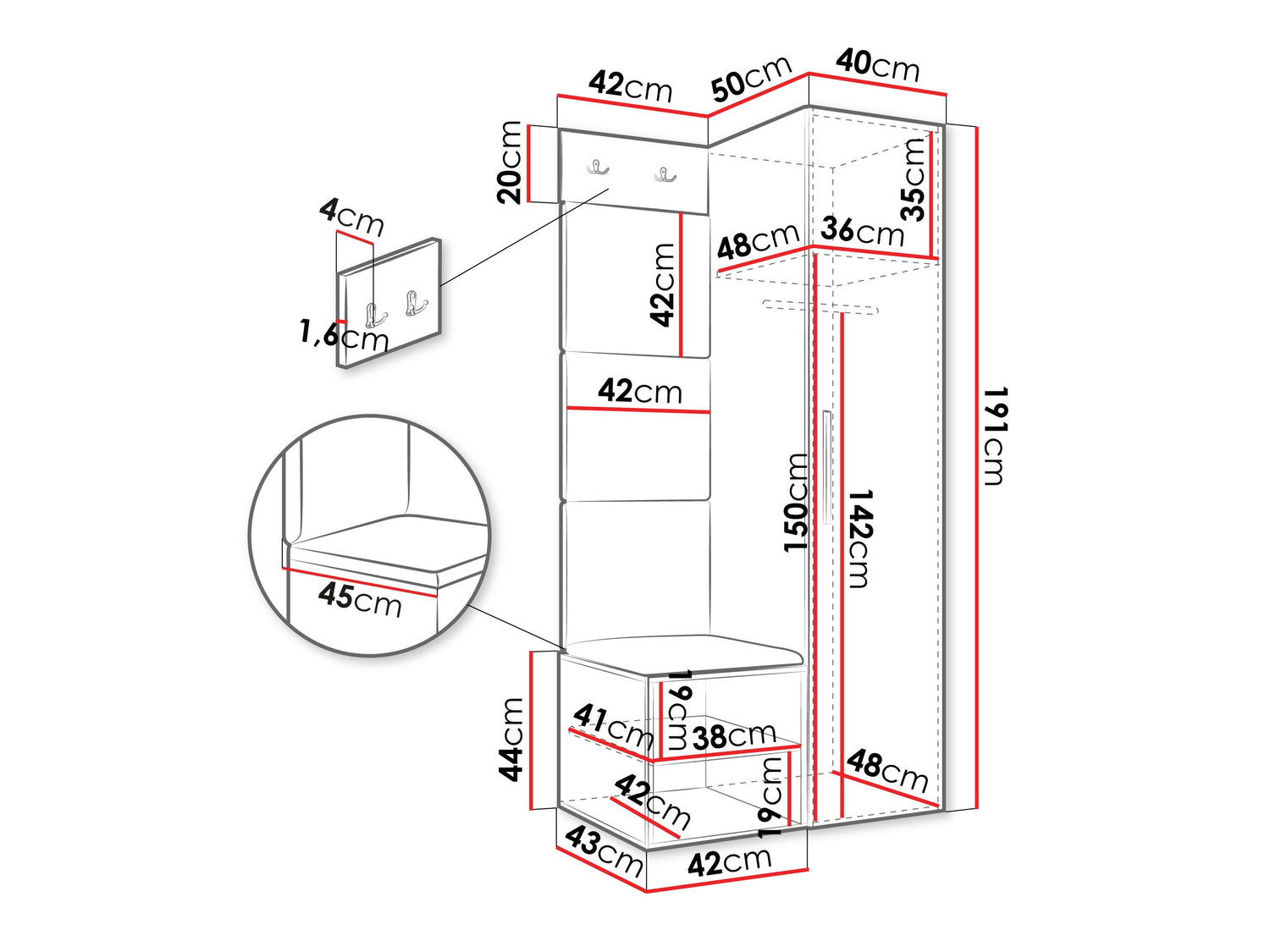 Dimensioner på garderobeskabe191 x 40 x 50 cm